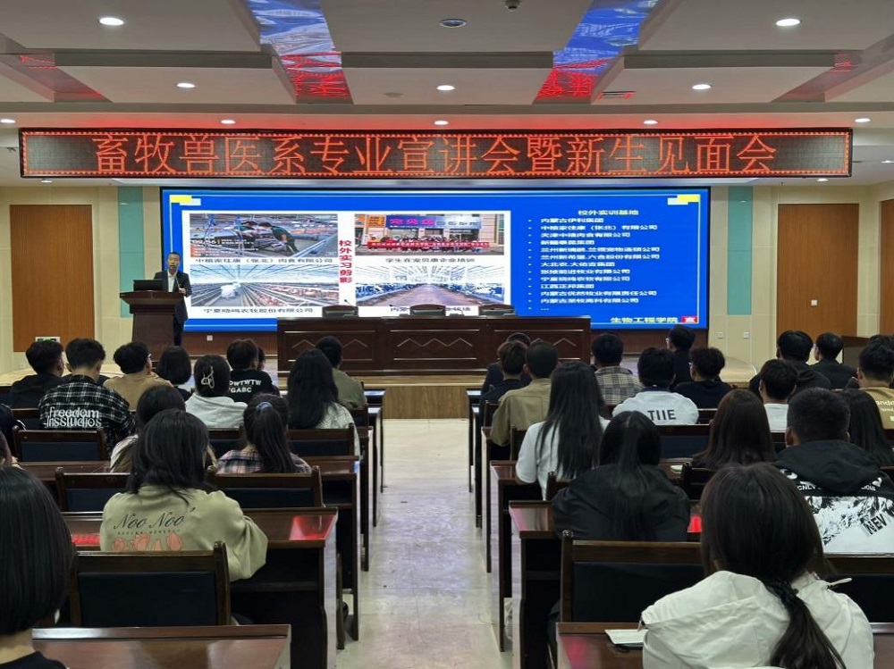 为提高生物工程学院2024级新生专业认知,树立专业自信,做好学业规划,2024年9月8日晚,生物工程学院分系开展了2024级新生专业宣讲活动。活动共有2024级畜牧兽医、动物医学、种子生产与经营、现代农业技术、园艺技术、生态环境修复技术、药品生物技术、生物产品检验检疫等8个专业558名新生参加。