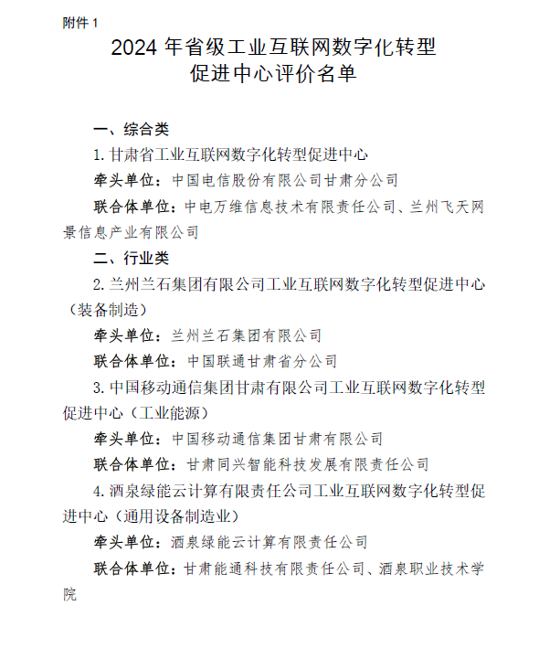 为深入贯彻国务院《制造业数字化转型行动方案》,结合推进《甘肃省加快推动工业领域“智改数转网联”三年行动计划(2024-2026年)》(甘工信发〔2024〕74号)重点任务,甘肃省工业和信息化厅于2024年6月开展了省级工业互联网数字化转型促进中心申报工作,酒泉职业技术学院与酒泉经济技术开发区酒泉绿能云计算有限责任公司、甘肃能通科技有限责任公司三家联合申报,成功获批公示 2024年省级工业互联网数字化转型促进中心。