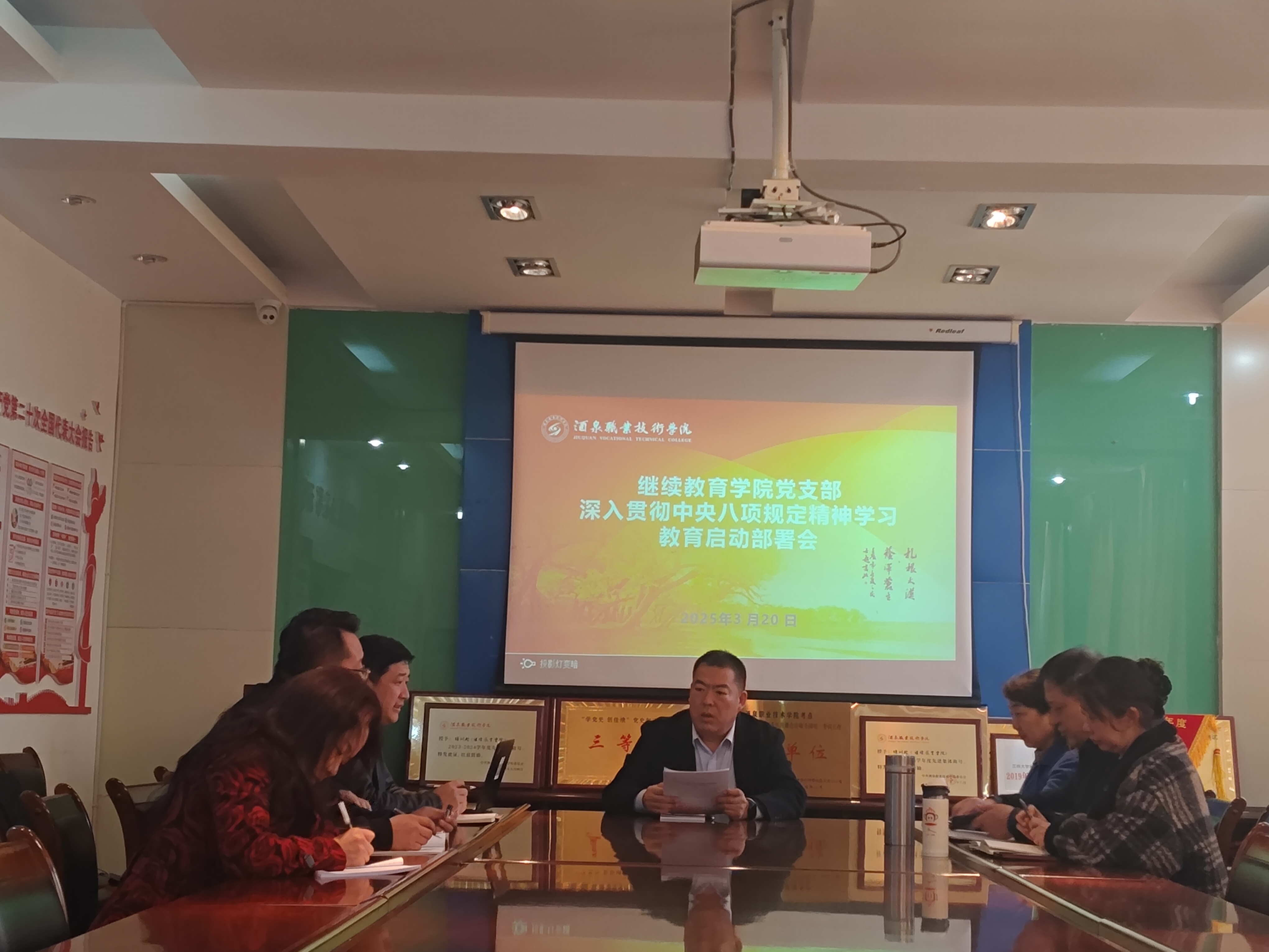 会议传达了《关于印发〈酒泉职业技术学院开展深入贯彻中央八项规定精神学习教育工作方案〉的通知》精神,安排部署了本部门开展深入贯彻中央八项规定精神学习教育工作。
