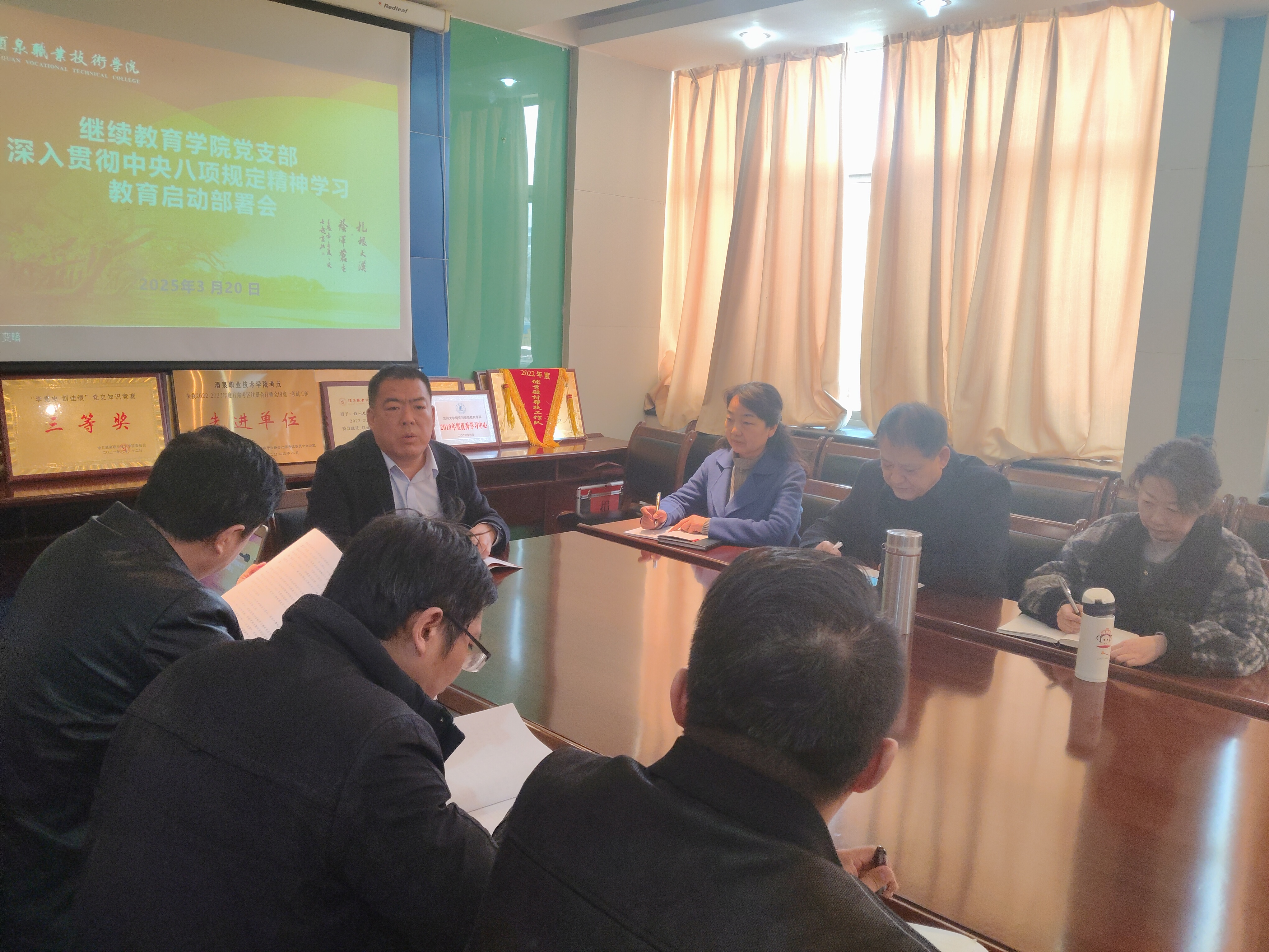 3月20日上午,继续教育学院党支部召开深入贯彻中央八项规定精神学习教育工作部署会,认真学习领会习近平总书记关于加强党的作风建设的重要论述,启动部署培训处(继续教育学院)深入贯彻中央八项规定精神学习教育工作。继续教育学院党支部书记张祥主持会议,全体党员参加会议。