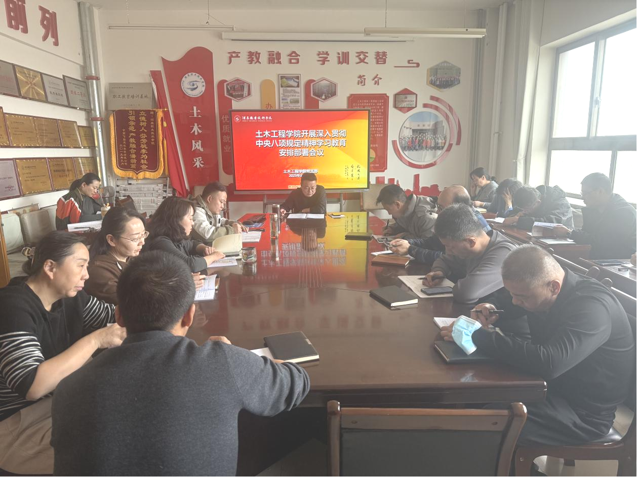 会议首先传达学习了《酒泉职业技术学院开展深入贯彻中央八项规定精神学习教育工作方案》精神,系统部署了学院开展学习教育的工作计划,安排学习了中央八项规定精神内容。