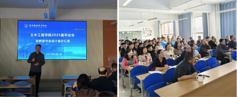 为了深化实践教学改革,推动高素质技术技能人才培养质量提升,全面强化学生创新实践能力和技术应用水平,2025年4月1日,土木工程学院在行知楼508教室开展了2025届毕业生创新型毕业设计汇报展示活动,由水利工程、建筑工程技术等6个专业共7个设计小组针对各自团队的创新型毕业设计成果进行了汇报。毕业设计内容突破传统设计思维理念,聚焦BIM技术应用、古建筑信息化修缮、智能化节水系统设计、灌区数字孪生系统设计等前沿工程技术领域,展现了应用新技术、新工艺数字化解决复杂工程问题的创新能力,彰显了学院“技能引领、创新驱动”的育人特色。