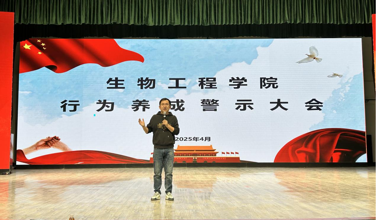 为深入贯彻落实立德树人根本任务,进一步规范学生日常行为,营造严谨求实、积极向上的校园氛围,生物工程学院于4月18日中午,在胡杨文化活动中心召开学生行为养成警示大会。学院副院长庞捷主讲,2023、2024级1000余名学生参加。