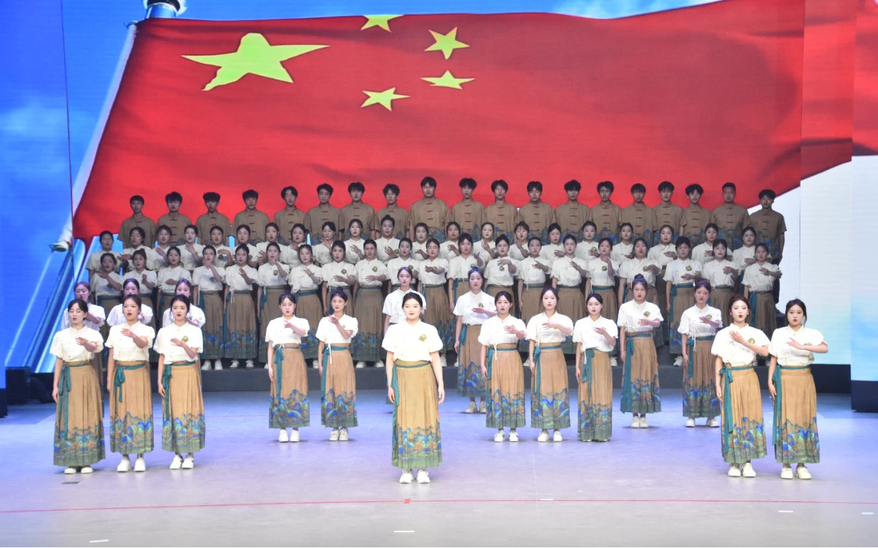 第五篇章《书润家园》中,来自学院不同专业的学子身着统一服装,以一曲《我爱你,中国》将晚会推向高潮。嘹亮歌声饱含对祖国的深情礼赞,层层叠起的和声如潮水般涤荡人心,展现了新时代青年的家国情怀与昂扬风貌,令现场观众久久回味。