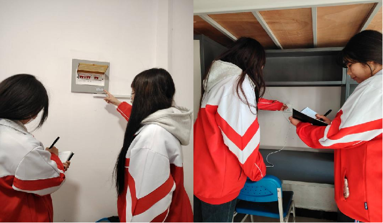 专项检查小组深入学生宿舍,对用电安全、消防设施、疏散通道等进行拉网式排查,重点整治私拉电线、违规使用大功率电器等问题,并严格重申宿舍禁烟要求,杜绝因烟头引发火灾的风险。此次行动覆盖男生公寓至信轩、女生公寓乐天阁及实习学生公寓,共检查寝室160余间,发现并整改安全隐患10处。针对问题宿舍,学院建立“清单销号”台账,确保隐患动态清零。