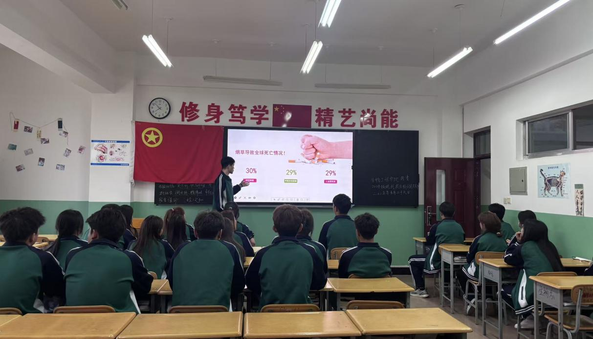 班会以专业视角切入烟草危害核心。深入剖析了烟草烟雾中焦油、尼古丁等有害物质对呼吸系统、心血管系统的破坏性影响,并结合医学知识,讲解了尼古丁如何作用于大脑受体引发成瘾机制,以及吸烟如何显著增加罹患肺癌等多种恶性疾病的风险。讲解内容既具科学深度又贴近学生认知,使同学们对“吸烟等于慢性自杀”这一论断有了具象化的理解。