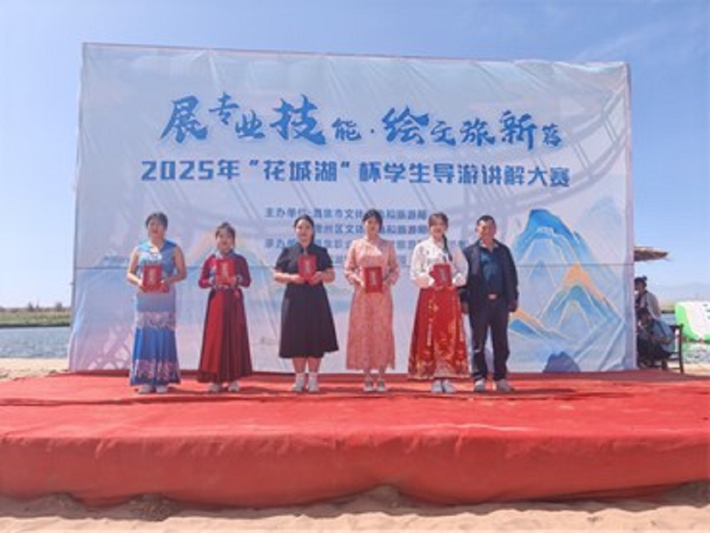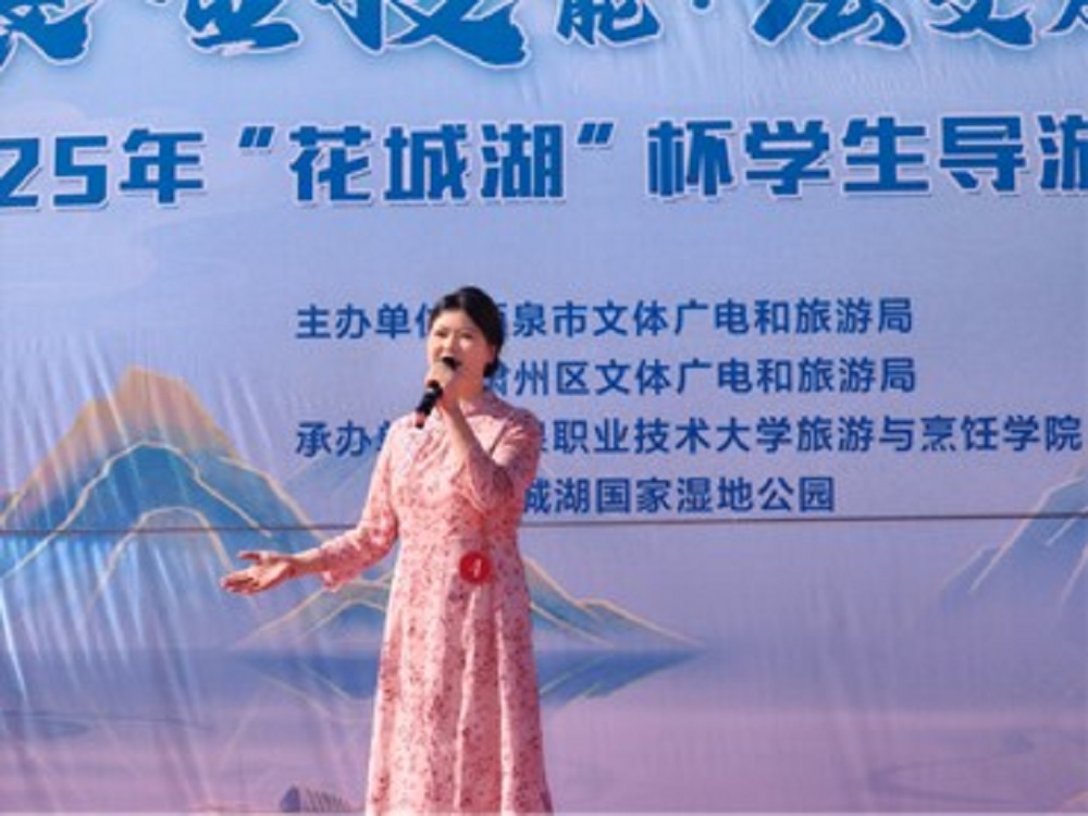 为深化教学成果,提升学生实践技能,2025年6月15日,由酒泉市文体广电和旅游局、肃州区文体广电和旅游局指导,酒泉职业技术大学旅游与烹饪学院联合花城湖景区承办的 “展专业技能·绘文旅新篇”2025年“花城湖”杯学生导游讲解技能大赛,在花城湖风景区成功举办。来自旅游与烹饪学院的选手同台竞技,以专业风采诠释丝路文旅魅力。