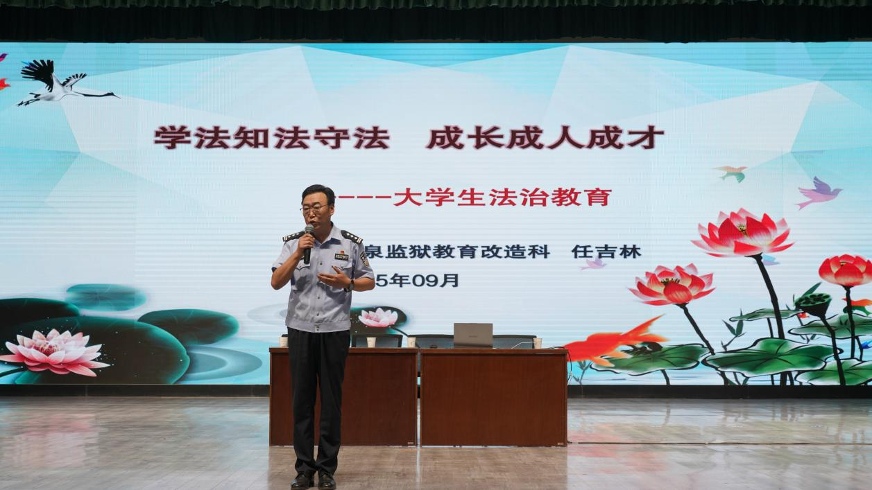 为深入学习贯彻法治思想,切实增强学生的法治观念和安全防范意识,9月5日,生物工程学院在胡杨活动中心召开以“学法知法守法 成长成人成才”为主题的“法治教育开学第一课”讲座。特邀酒泉监狱教育改造科任吉林主任担任主讲嘉宾,学院党支部书记、院长张涛及全体2023、2024级在校学生共同参加了此次活动。