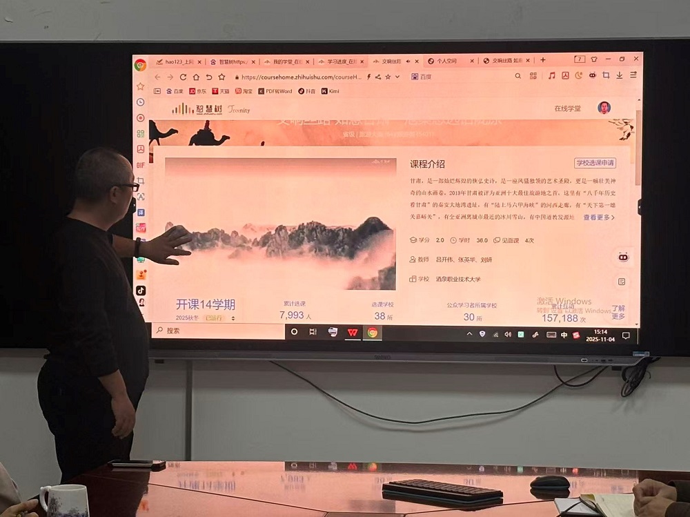 吕开伟重点汇报了《甘肃导游》课程的建设进展。该课程作为学校重点打造的线上线下混合式核心课程,面向旅游管理本科学生开放,该课程充分挖掘甘肃丰富的旅游资源,着力提升学生的专业能力与地域文化认同。该课程在前期省级精品课的基础上,结合旅游管理专业职业本科建设,计划将课程图谱建设及智能体建设列入下一阶段建设计划。