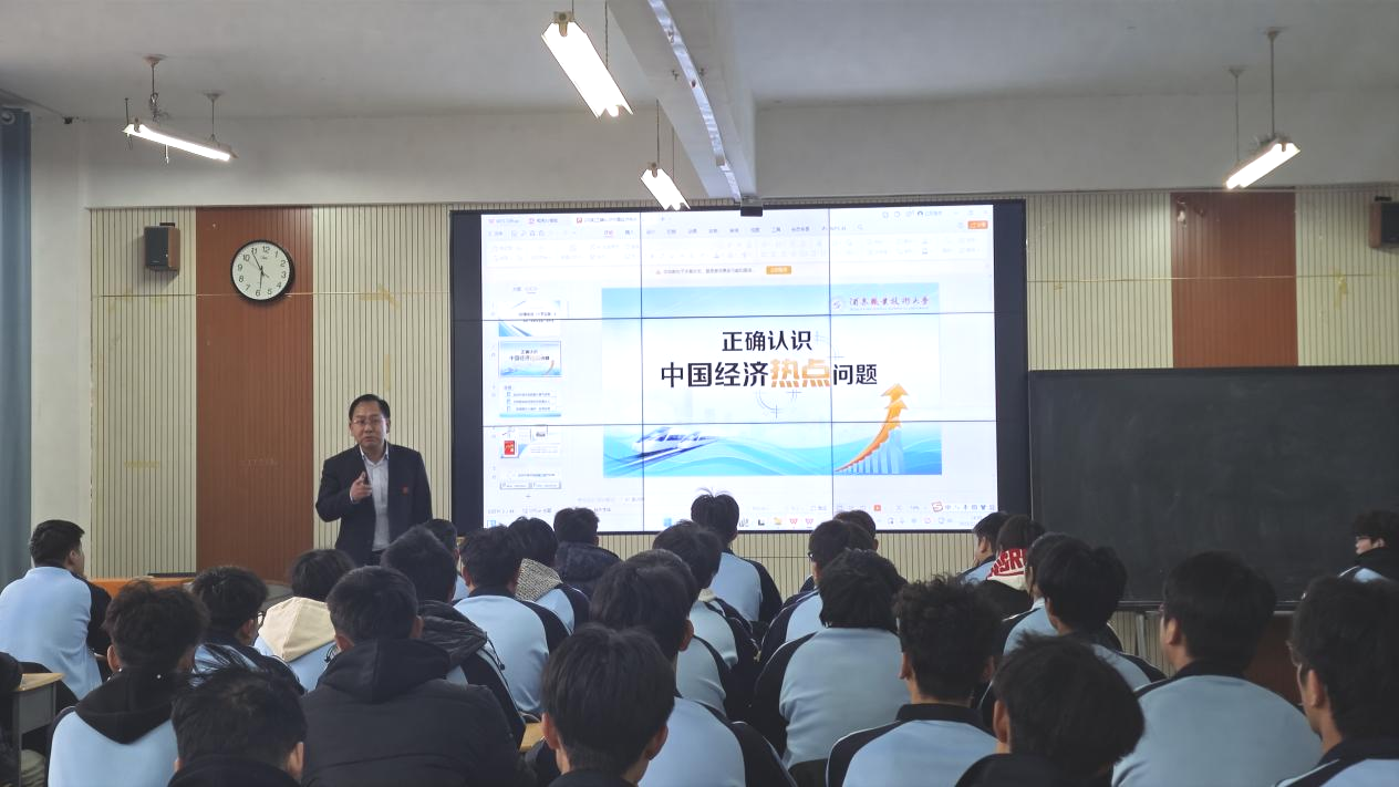为深入贯彻落实立德树人根本任务,引导学生胸怀“国之大者”、把握发展大势,将个人成长融入国家发展全局,12月11日,学校党委委员、副校长施荣教授走进土木工程学院,为2024级工程测量技术、摄影测量与遥感技术专业学生讲授了一堂主题鲜明、内容深刻的形势与政策课。本次课程以“正确认识中国经济热点问题”为题,聚焦当前经济社会发展中的重点与前沿问题展开。