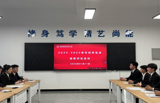 院系动态 > 正文为深入学习贯彻习近平新时代中国特色社会主义思想,全面落实共青团中央、全国学联关于深化高校学生会组织改革的有关要求,进一步规范和加强学生会工作人员述职评议制度,根据《普通高等学校学生会(研究生会)章程制定办法》《普通高等学校学生(研究生)代表大会工作规定》及学校相关制度,学校学生会于2026年1月11日组织召开2025-2026学年述职评议工作会议。校团委负责同志、校学生会秘书长、校院两级学生会组织主席团成员、工作部门负责人及学生代表共40余人参加会议。