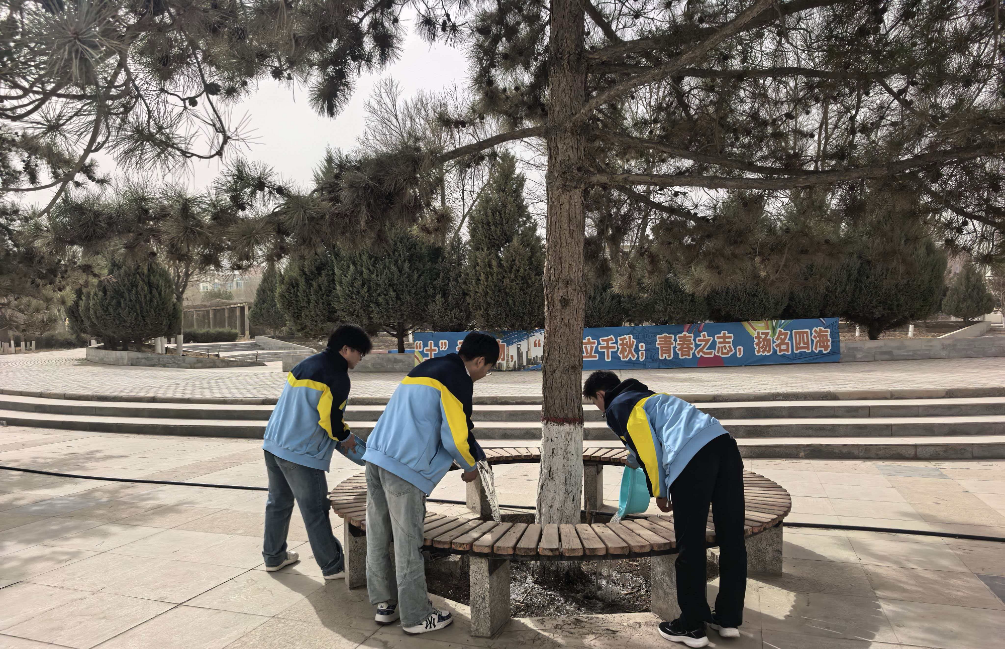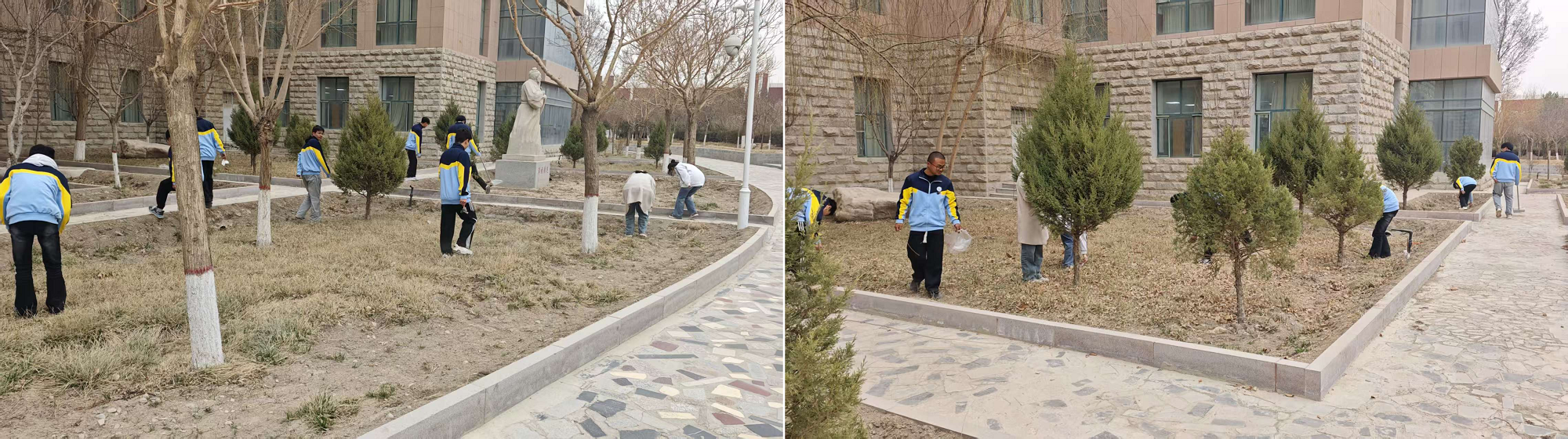 活动中,身着统一服装的学生志愿者们热情高涨,分工协作。大家手持水桶、脸盆等工具,有序地在校园图书馆周边区域集结,认真为每一株树木浇灌“返青水”。随后,志愿者们俯身清理绿化带内的枯枝杂草和白色垃圾,不放过任何一个死角。一桶桶清水浇灌的是生命的希望,一次次俯身守护的是校园的生机。青春步履与草木新绿彼此辉映,书写着校园里最美的生态诗篇。