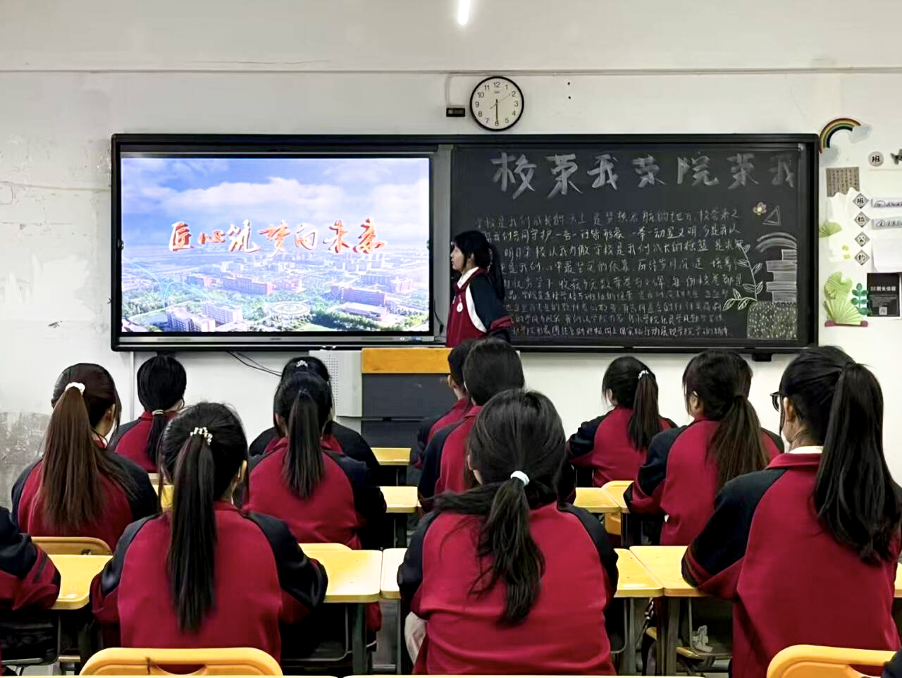 班会期间,同学们集中学习了学校在人才培养、社会服务、文化传承创新等方面的重要办学成就。通过回顾学校从建校初期办学探索,到跻身国家“双高”建设行列、升格职业技术大学的跨越式发展历程,引导同学们深刻把握学校发展的历史脉络与辉煌成就,深刻体悟“校兴我兴、校荣我荣”的深层内涵,切实将爱校情怀转化为成长成才的内生动力。