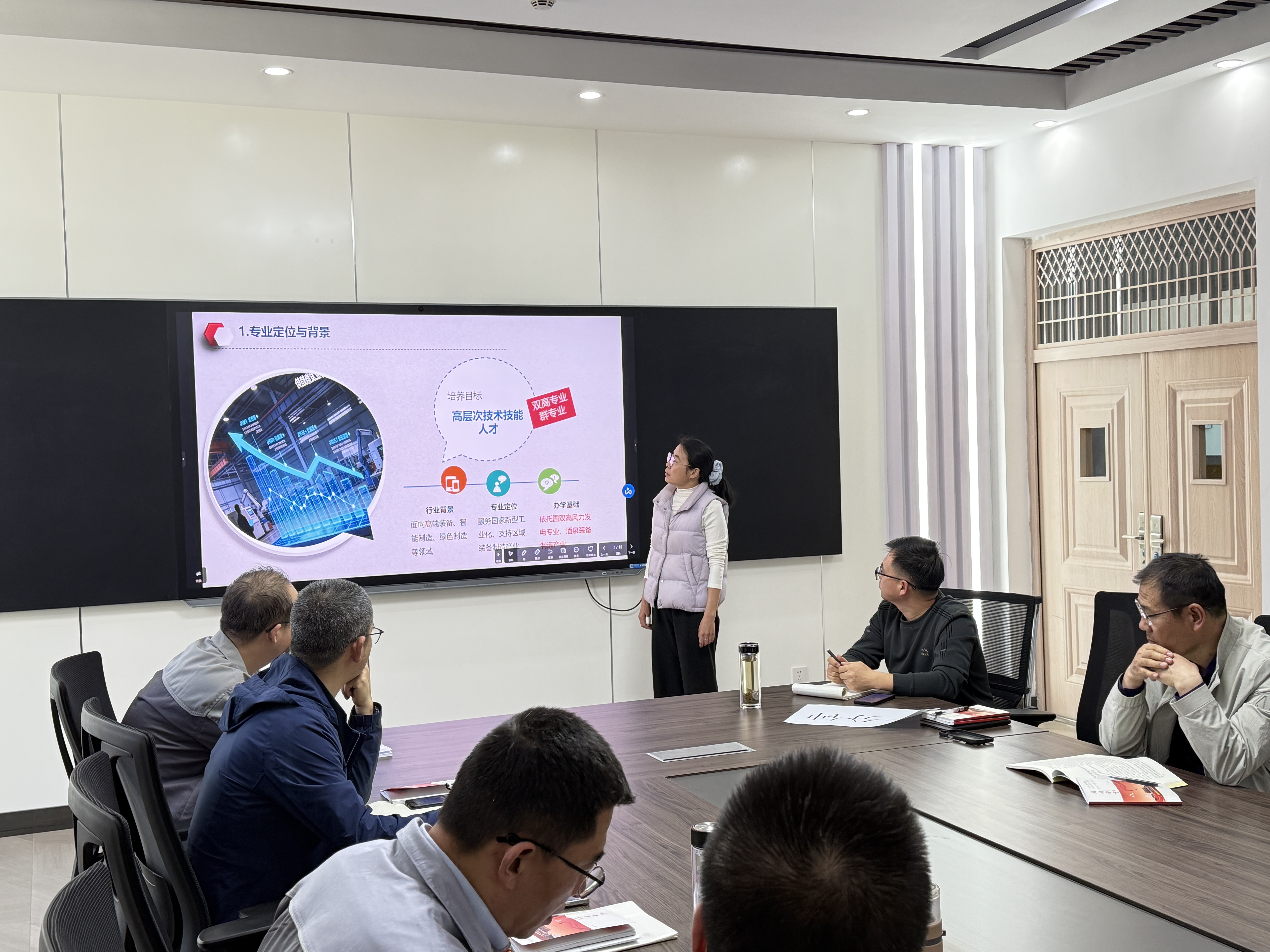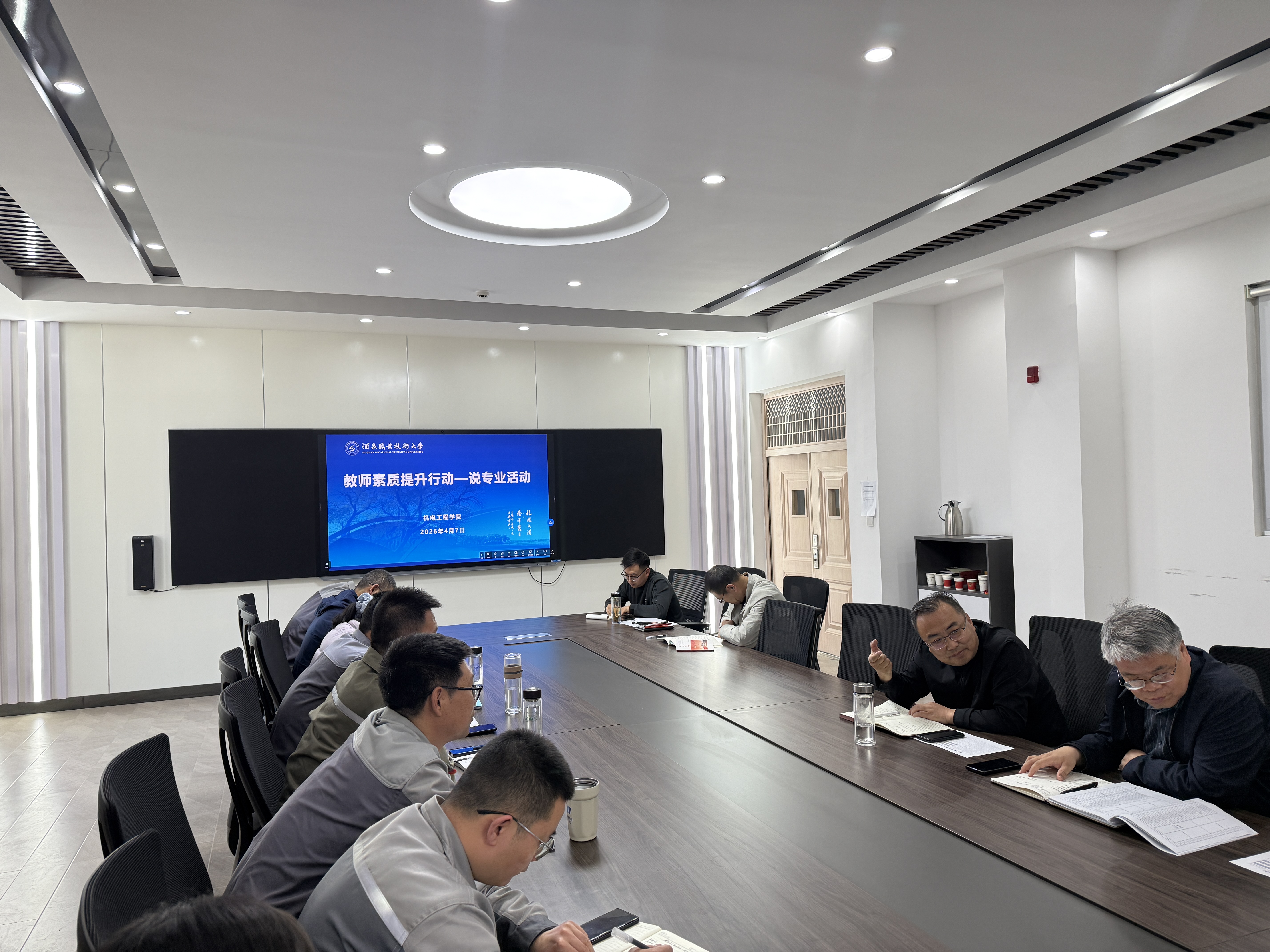 按照学院安排,5位专业负责人围绕专业教学标准、人才培养方案、现代学徒制及现场工程师培育等进行系统汇报。机械制造及自动化专业负责人汪玉凤结合酒泉装备制造产业需求,介绍了“岗课赛证”融通课程体系及产教融合基地建设进展;智能焊接技术专业负责人闫旺聚焦机器人焊接技术,展示了“现场工程师”订单班阶段性成果;机电一体化技术专业负责人李小兵围绕智能制造产线,汇报了专业教学资源库建设情况;电气自动化技术专业负责人闫兴瑞以PLC应用技术为核心,提出“金课程”与“金教材”协同建设路线图;汽车检测与维修技术专业负责人于天祥分享了与吉利产教融合的经验。五位负责人汇报数据翔实,思路清晰。