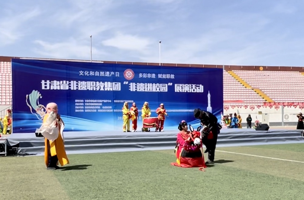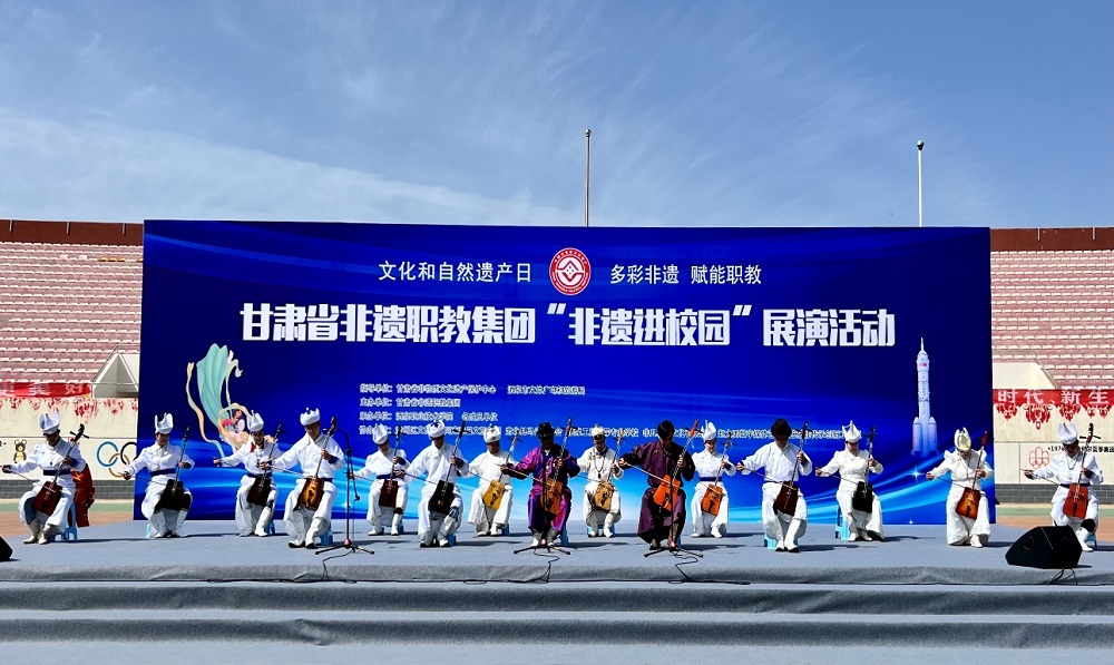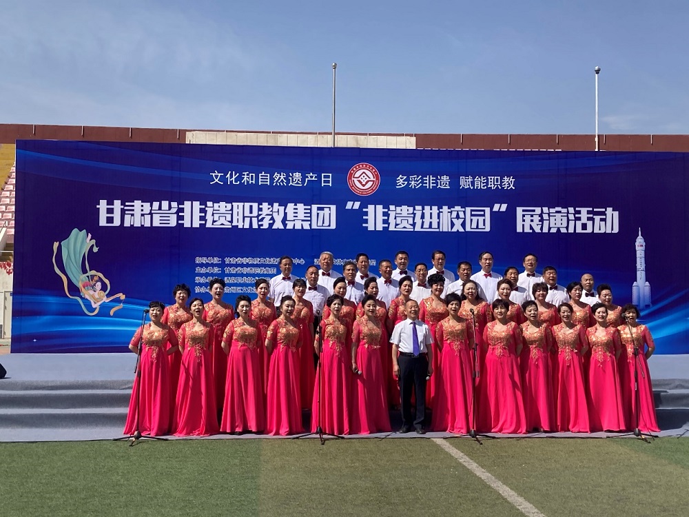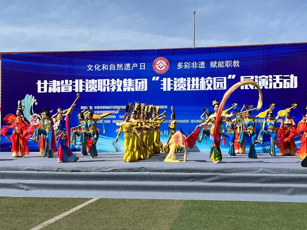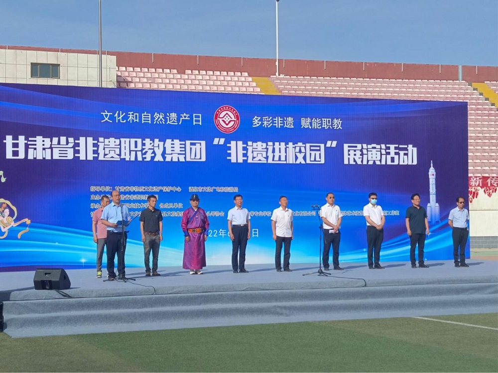 要闻快递 > 正文6月11日是文化和自然遗产日,上午,甘肃省非遗职教集团“非遗进校园”展演活动在酒泉职业技术学院体育场举行。活动的主办单位是甘肃省非遗职教集团,承办单位为酒泉职业技术学院旅游与烹饪学院,协办单位为肃州区文化馆、阿克塞县文化馆、玉门市文化馆、肃北县文化馆、酒泉故事文化创意产业园、江苏非凡智旅信息技术有限公司、赵大勇数字媒体艺术技艺技能传承创新工作室。酒泉职业技术学院党委书记、校长易志军、甘肃省非遗保护中心刘卫华、酒泉职业技术学院党委副书记、甘肃省非遗职教集团常务副理事长许军、甘肃省非遗职教集团秘书长杨洁等领导及300多名师生参加开幕式,同时,省内部分职业院校、非遗组织在线上参与此次活动。