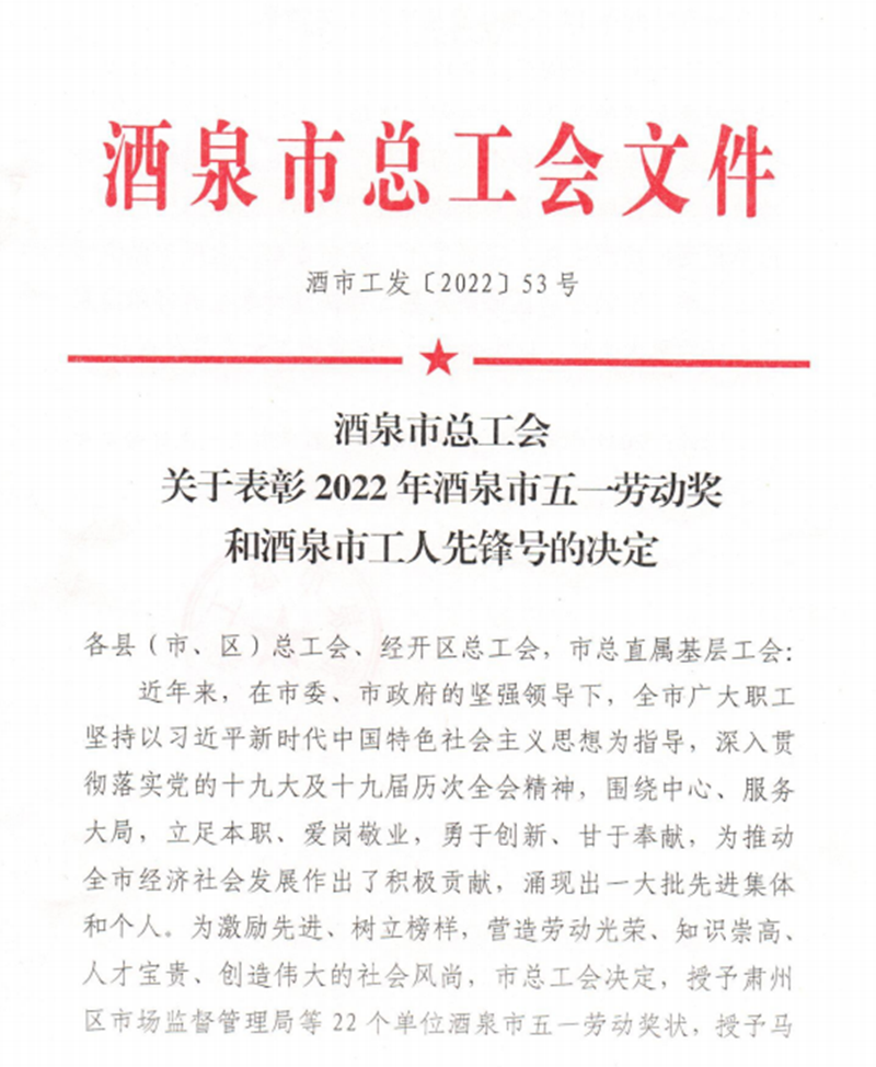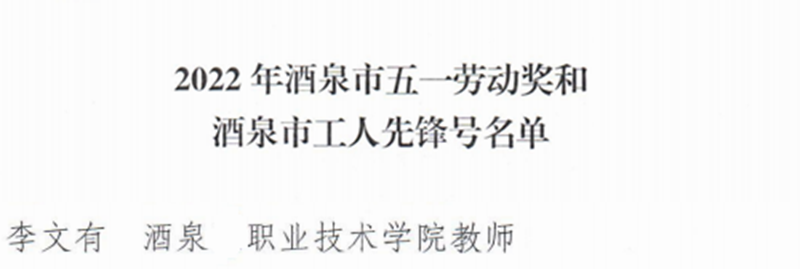 为鼓励先进,进一步树立崇尚技能、崇尚人才、崇尚创新的价值导向,近日,酒泉市总工会发布了《酒泉市总工会关于表彰2022年酒泉市五一劳动奖和酒泉市工人先锋号的决定》,我校教师李文有被授予2022年酒泉市“五一劳动奖章”。
