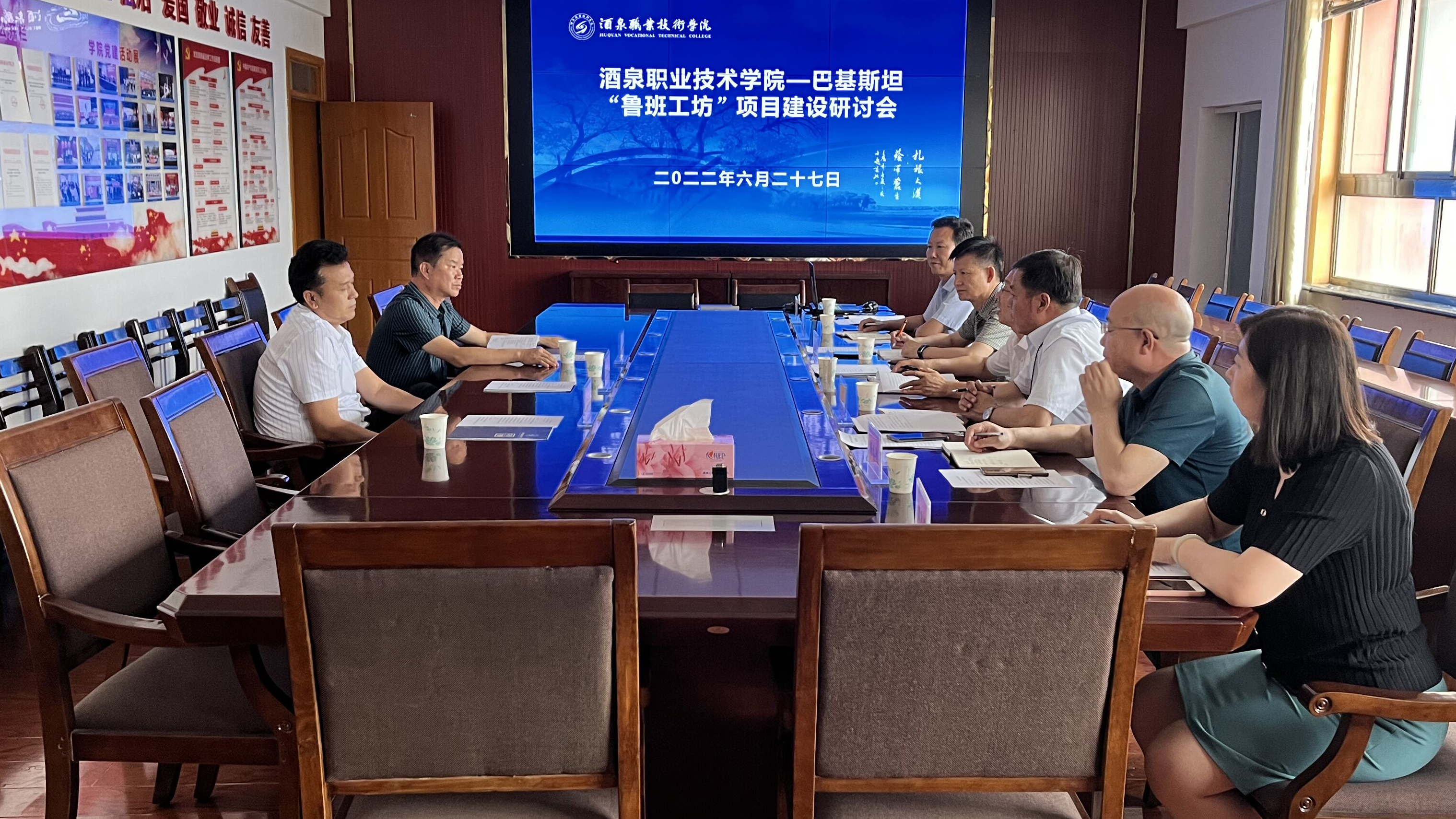 为加强国际交流与合作,拓展海外教学实践基地,2022年6月27日,酒泉职业技术学院-巴基斯坦“鲁班工坊”项目建设研讨会在我校召开。会议由校外事办主任孙俊峰主持,学校党委书记、校长易志军出席会议并发言。市外事办副主任邓挺林、业务科科长张维强、巴基斯坦中国商会九州工程机械进出口贸易有限责任公司董事长魏刘柱应邀出席会议,学校国际交流学院院长杨春骋、新能源学院院长冯黎成、生物工程学院院长武兴宝及相关教师参加会议。