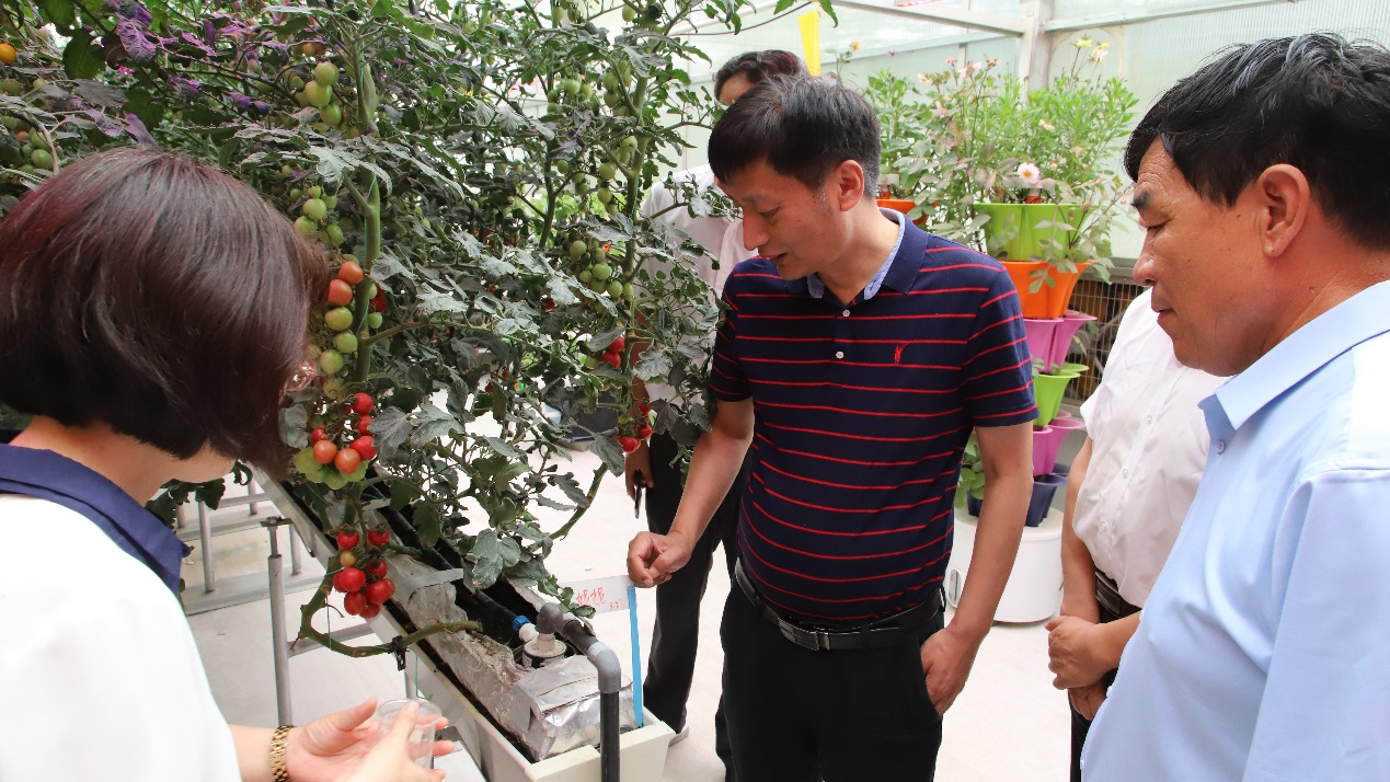 首先,喻景权院士专家团队来到智慧农业实训室实地查看轻简无土栽培水果番茄示范项目的实施和运行管理效果,充分肯定轻简自控技术示范的良好现状,针对现阶段运行管理过程中技术、模式和设备等专业方面提出改进意见。