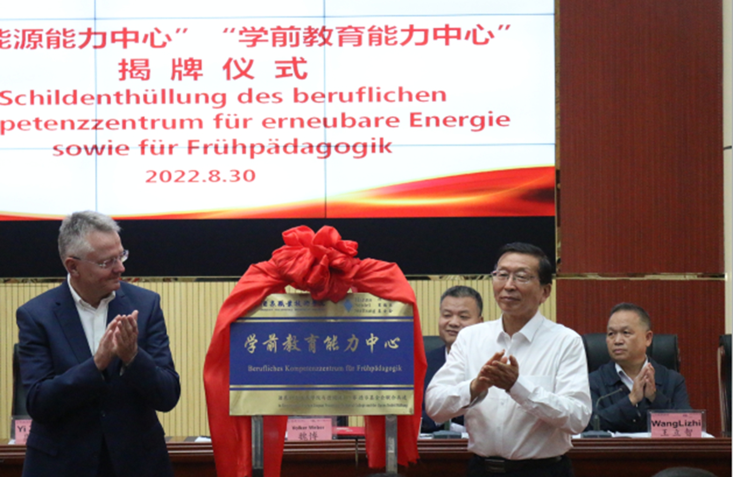 邹志平副局长、学校易志军书记、魏博先生分别为“甘肃国际职教师资交流培训基地”、 “德国专家流动工作站” 、“新能源能力中心”、“学前教育能力中心”揭牌。校长易志军和赛会西部项目负责人魏博共同签订合作协议。