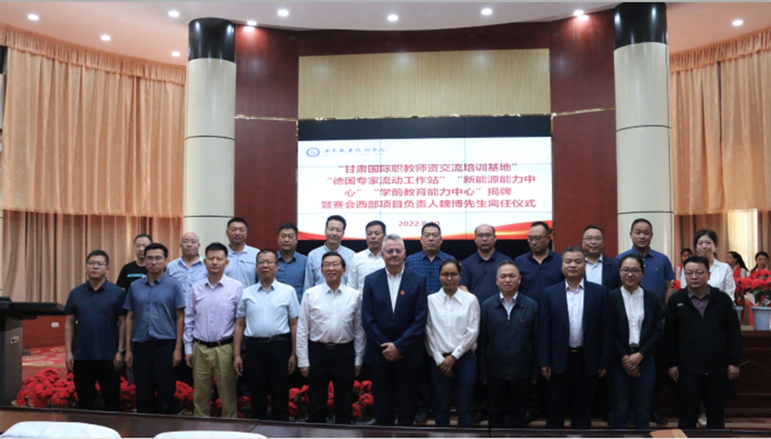 要闻快递 > 正文2022年8月30日上午,学校在逸夫报告厅隆重举办“甘肃国际职教师资交流培训基地”“德国专家流动工作站”“新能源能力中心”“学前教育能力中心”揭牌暨赛会西部项目负责人魏博先生离任仪式。 德国汉斯·赛德尔基金会甘肃代表处首席代表福尔克·魏博及其夫人尤塔布·魏博、酒泉市教育局副局长邹志平、酒泉职业技术学院党委书记、校长易志军、学校党委党员、宣传统战部部长王金明、外事办,教师发展中心、各二级学院负责人及学生代表参加会议。学校党委委员、副校长王立智主持仪式。