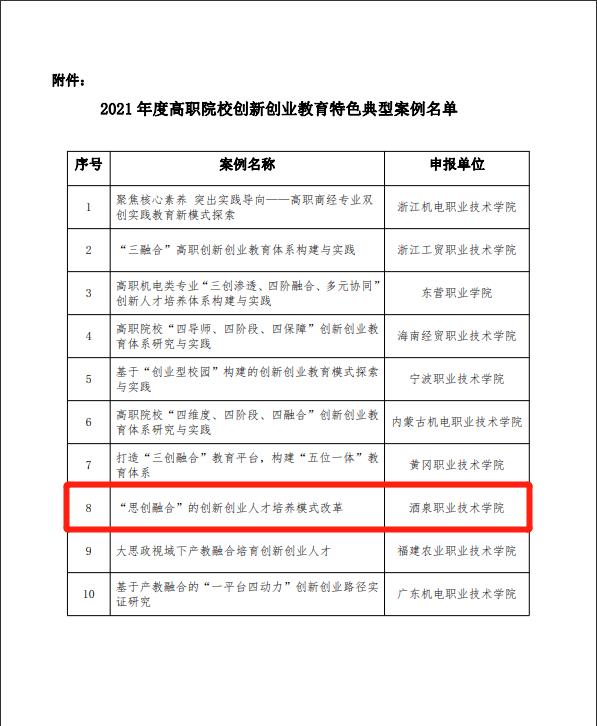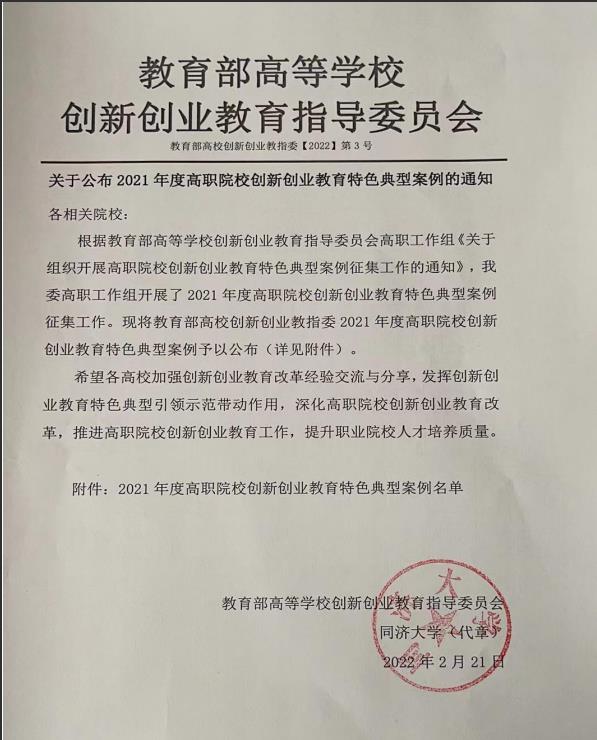 为深入贯彻习近平新时代中国特色社会主义思想和党的十九大精神,全面贯彻落实全国教育大会和《国家职业教育改革实施方案》精神,提升职业院校人才培养质量,深化高职院校创新创业教育改革,促进创新创业教育与专业教育、与思想政治教育融合发展,教育部2018-2022年高等学校创新创业教育指导委员会特委托高职工作组面向全国高职院校征集2021年创新创业教育特色典型案例,经过推荐申报、专家评选、社会调查等环节,近日公布了2021年度高职院校创新创业特色典型案例,我校案例《“思创融合”的创新创业人才培养模式改革》成功入选(全国仅10所高职院校申报案列入选)。