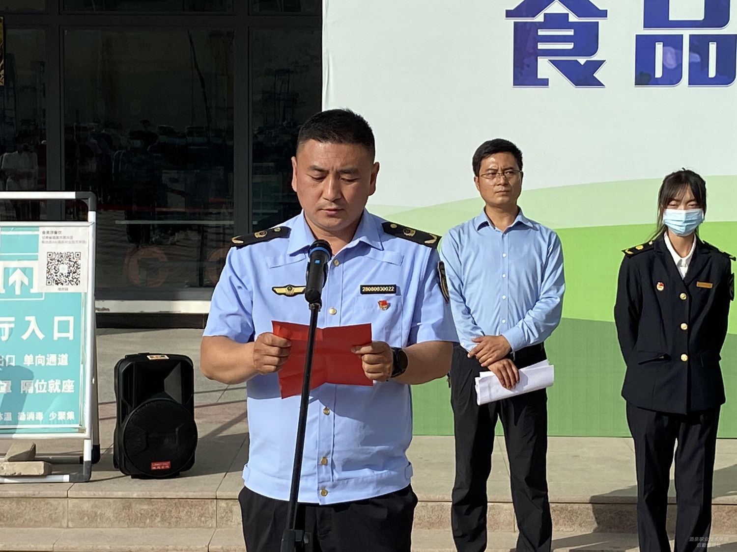 酒泉市市场监督管理局餐饮科科长卢成元宣读了《食品安全倡议书》,飞天餐厅业主张丽代表学校餐饮服务窗口作承诺发言,韩义凡同学代表校学生会进行了发言。