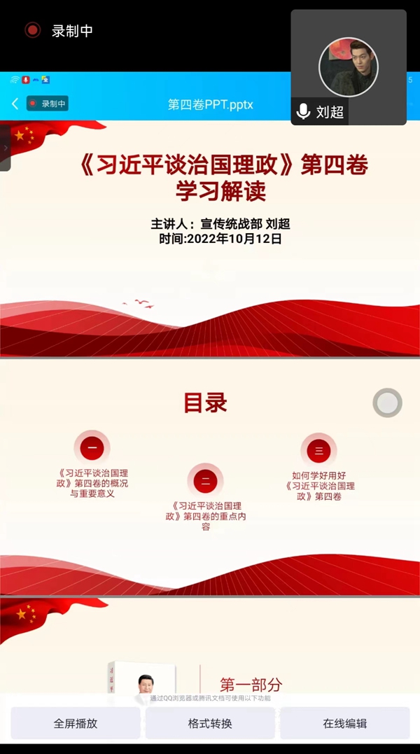 马克思主义学院刘超老师从基本概况、重要意义、重点内容和如何学好用好《习近平谈治国理政》第四卷等方面进行了解读和分享。通过学习,大家一致认为《习近平谈治国理政》第四卷与前三卷一脉相承、有机统一,生动记录了党和国家各项事业新的重大进展,集中展示了马克思主义中国化的最新成果,是一部闪耀着马克思主义真理光芒的经典文献,为全面建设社会主义现代化国家、实现中华民族伟大复兴提供了强大思想武器和科学行动指南。
