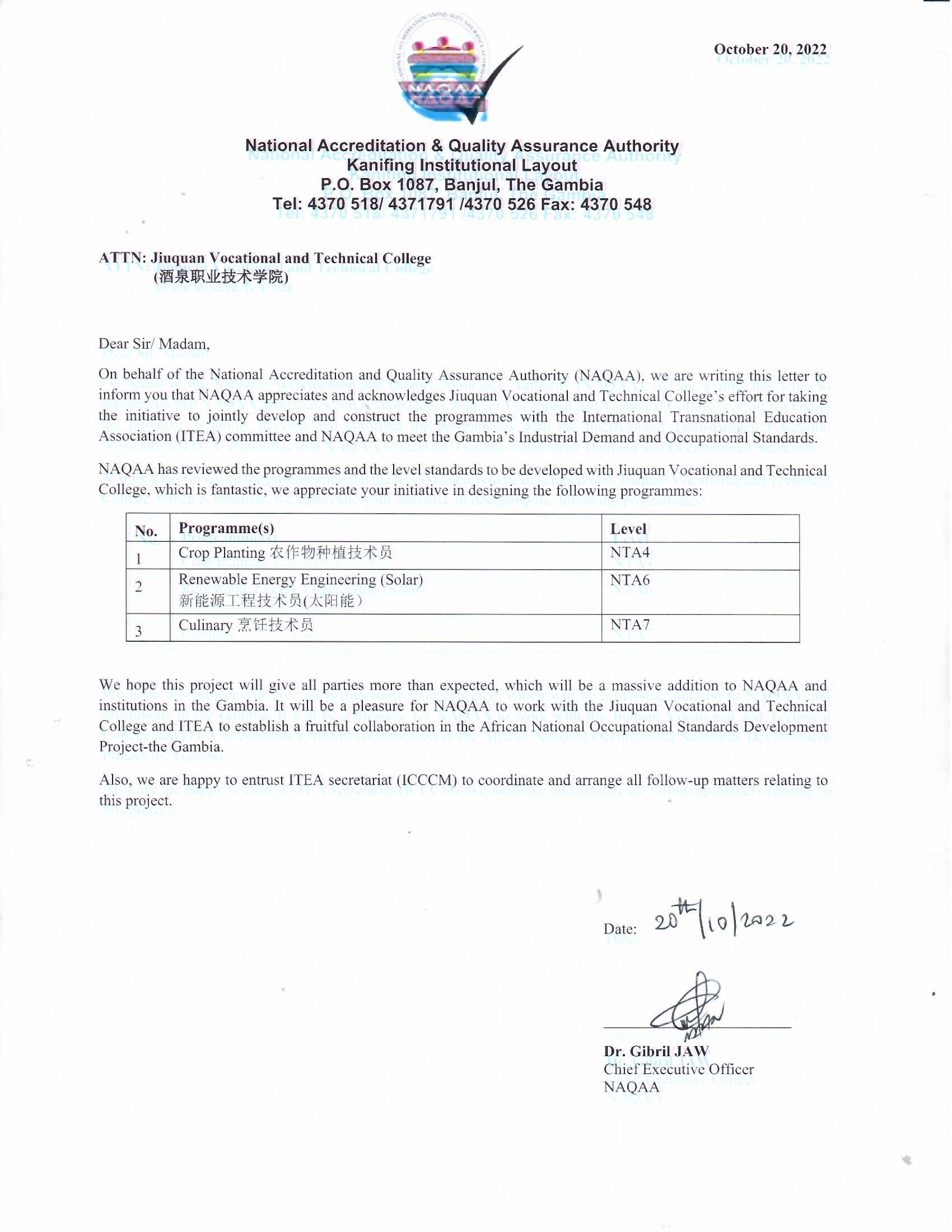 这次申报“冈比亚国家职业标准开发项目”,学校专门成立工作小组,由主管校领导主抓,国际交流处牵头,旅游与烹饪学院、新能源工程学院、生物工程学院积极参与,经过反复沟通、研讨、评估、论证、答辩,通过国内外专家评审,烹饪技术员NTA7职业标准、新能源工程技术员(太阳能)NTA6职业标准、农作物种植技术员NTA4职业标准3个项目成功获批立项建设。