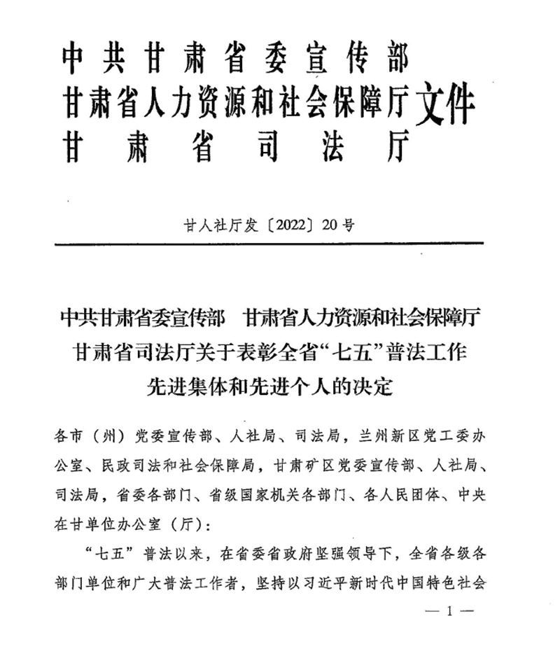 今年,中共甘肃省委宣传部、甘肃省人力资源和社会保障厅、甘肃省司法厅联合开展了全省“七五”普法工作先进集体和先进个人评选工作,经逐级审核推荐、评选公示,酒泉职业技术学院被评为“全省'七五'普法工作先进集体“称号,是全省唯一获此殊荣的高职院校。