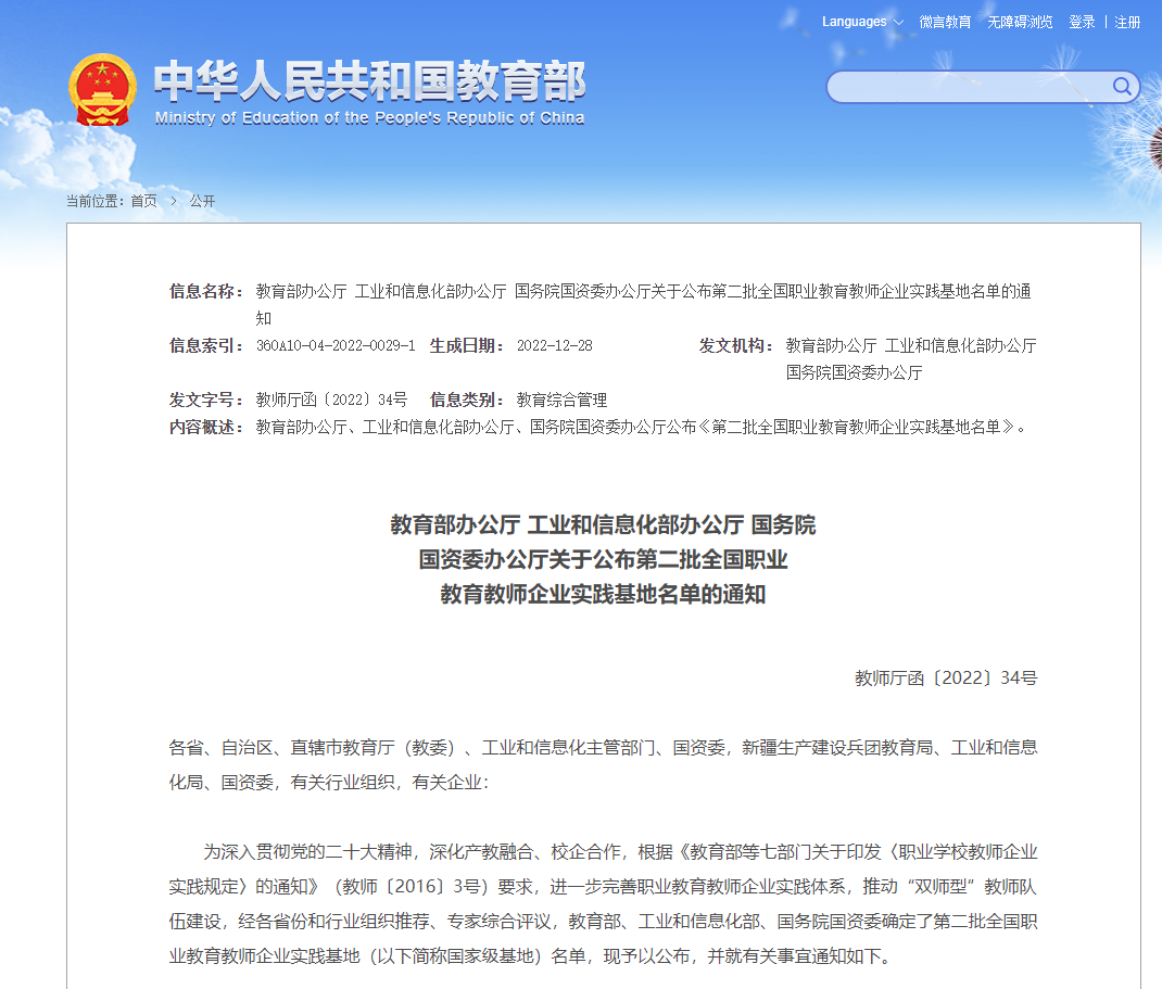 全国职业教育教师企业实践基地,是国家为了深化产教融合、校企合作,发挥企业在职教师资队伍建设中的重要作用,加快建设一支新时代高素质“双师型”教师队伍,遴选的一批能够代表行业先进水平,在全国乃至国际具有一定的影响力,有覆盖较广专业面的岗位群和产业链,具有长期校企合作基础与经验的企业。