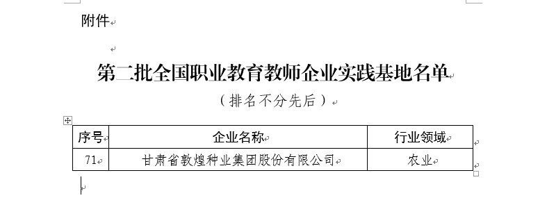日前,教育部办公厅、工业和信息化部办公厅、国务院国资委办公厅联合印发了《关于公布第二批全国职业教育教师企业实践基地名单的通知》,正式公布了第二批全国职业教育教师企业实践基地名单。在目前所有认定批中,甘肃省敦煌种业集团股份有限公司是唯一一家甘肃入选的农业领域企业!