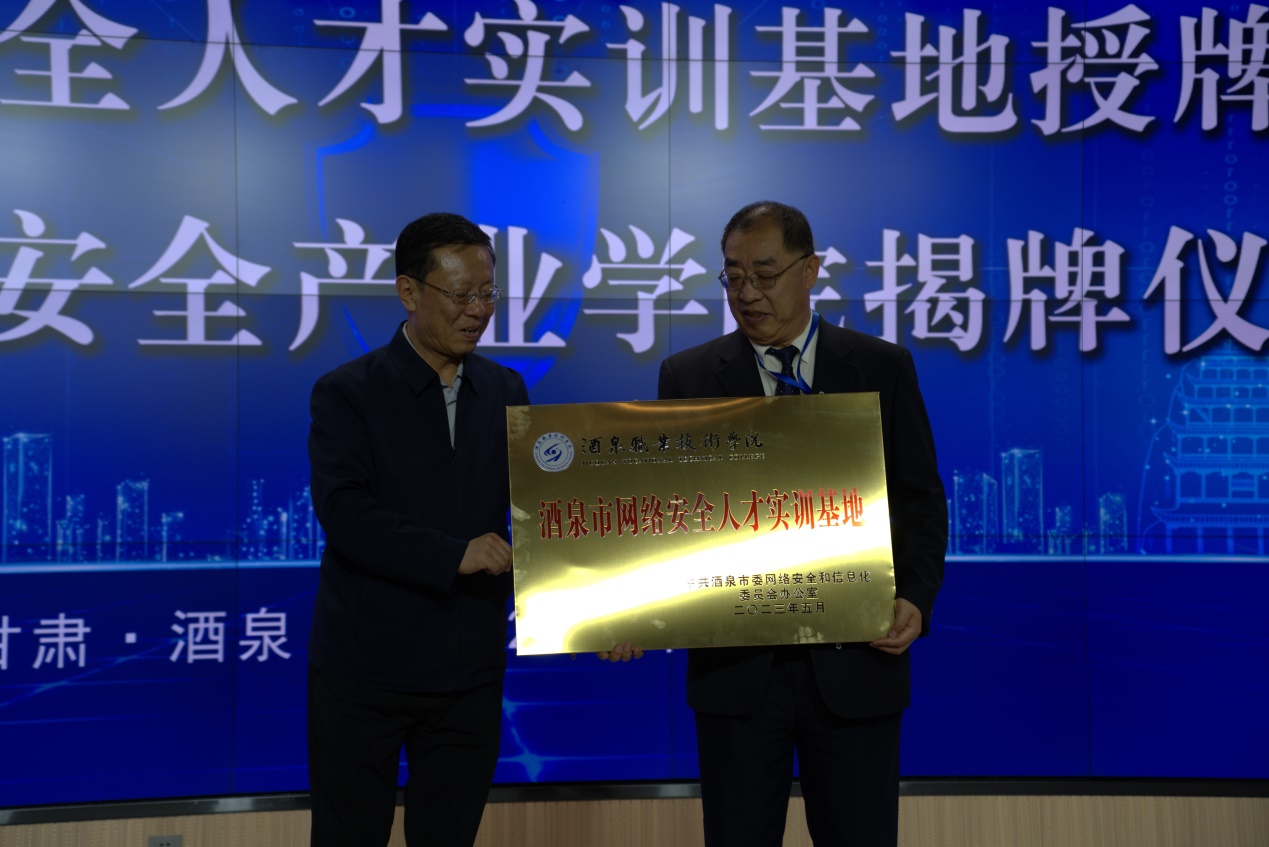 酒泉市人大常委会主任李永军为酒泉职业技术学院授“酒泉市网络安全人才实训基地”牌,学校党委副书记许军接牌。