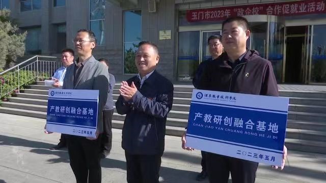 王立智副校长代表学校,和玉门市副市长贾万泰一起为玉门市老市区管委会、玉门东建材化工工业园授“产教融合基地”牌,为工业园区提质增效添砖, 助力老工业基地迸发新活力。