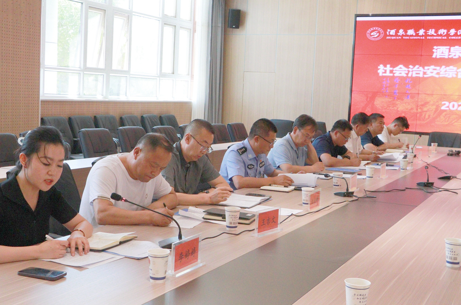 要闻快递 > 正文为进一步落实社会治安综合治理工作实效,有针对性地解决治安突出问题,切实维护安全稳定校园生态,6月14日下午,学校召开了2023年上半年社会治安综合治理多方联席会,解放路社区综治中心主任杨彦文、火车站派出所所长闫晓峰出席会议,学校党委委员、副校长施荣,酒泉卫校、工贸中专、附属幼儿园主管安全负责人及相关职能部门负责人,各学院主管学生安全工作副院长等参加会议。会议由应急安稳处处长王瑜珲主持。