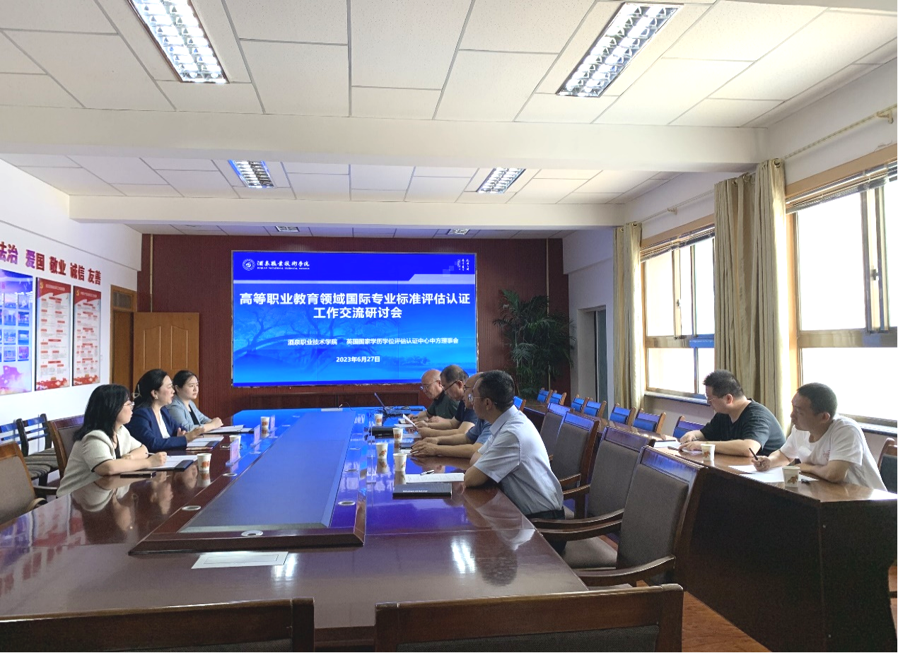 为提升我校国际化办学水平,助力“双特高”专业建设,2023年6月27日,英国国家学历学位评估认证中心中国首席代表李华杰、英国国家学历学位评估认证中心对外联络部主任张辂、英国国家学历学位评估认证中心中方理事会对外联络部丁雨婷三人来我校进行国际专业标准评估认证研讨交流。酒泉职业技术学院党委副书记许军、教务处处长杨洁、国际交流学院院长杨春骋及新能源工程学院副院长程明杰和部分相关教师参加了此次会议,会议由酒泉职业技术学院国际交流学院院长杨春骋主持。
