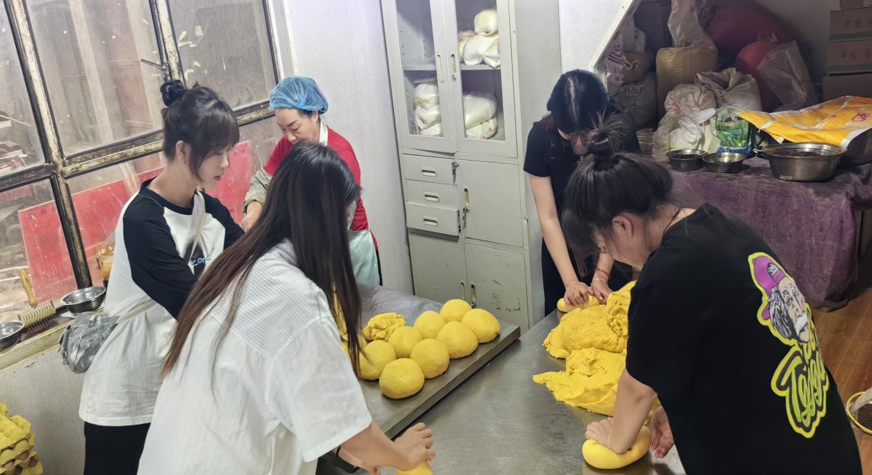 在酒泉锅盔同学们详细了解了锅盔的创新工艺、制作过程并参与到锅盔的制作中。