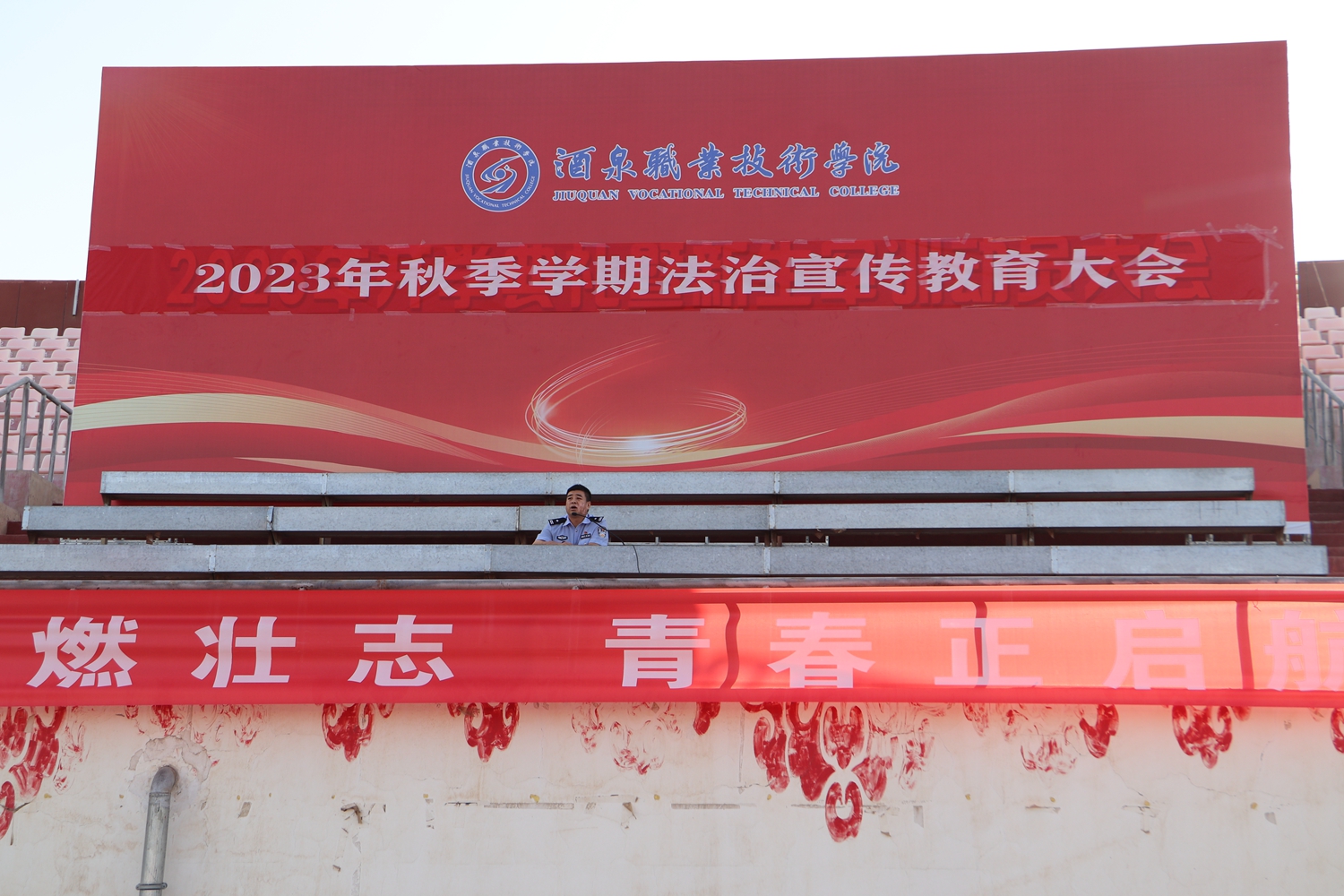 为深化“平安校园”创建,进一步扩大普法宣传“进校园”覆盖面,提升“新生普法第一课”特色效应和品牌效应,切实增强师生员工的法律意识和自我保护能力。9月14日,学校邀请酒泉市公安局肃州分局火车站派出所进校开展普法宣传活动。各学院负责人、班主任、辅导员、2023级全体新生4000余人参加了此次活动。