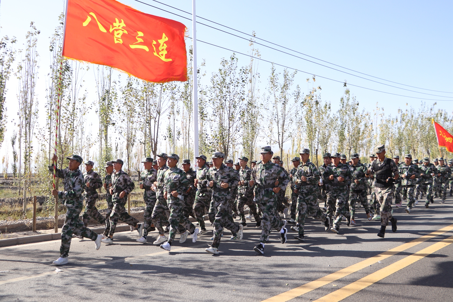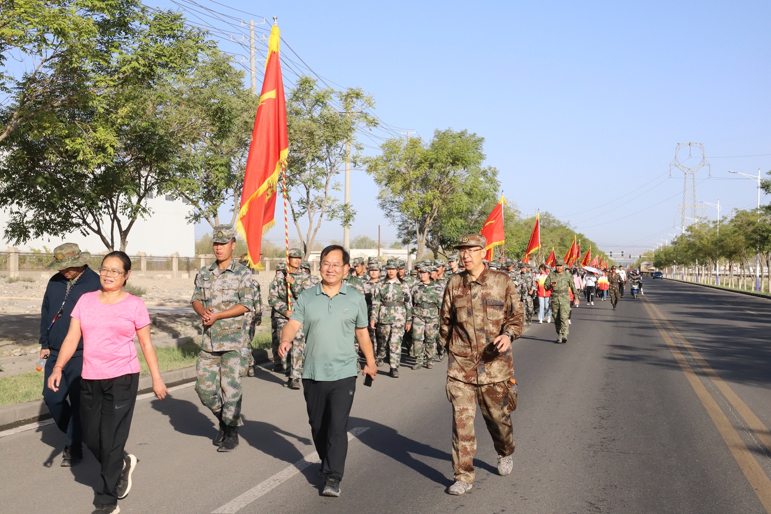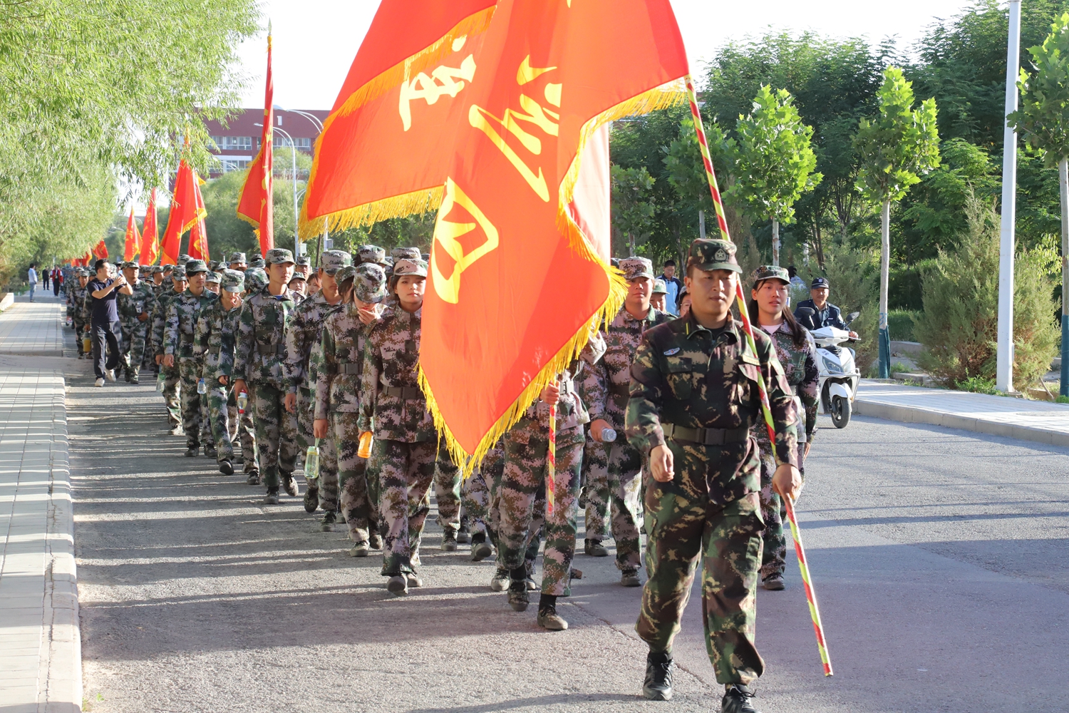 随着总指挥的一声令下,同学们在校旗的引导下,雄赳赳、气昂昂地踏上了校外拉练的征程。全体新生精神抖擞、步履矫健,喊着嘹亮的口号,拉练队伍气势磅礴,迷彩军绿,绵延几公里。同学们飒爽的英姿、整肃的军容、良好的精神状态吸引了沿途路人纷纷驻足称赞,充分体现了酒职学子勇于挑战、敢于拼搏的过硬作风和良好的精神风貌。综合工作组、宣传报道组、车辆保障组、交通疏导组和安全管理组相互配合、密切协作、各司其职、各负其责,圆满地完成了此次军训拉练活动的各项保障任务。