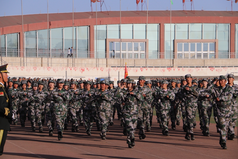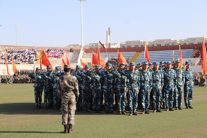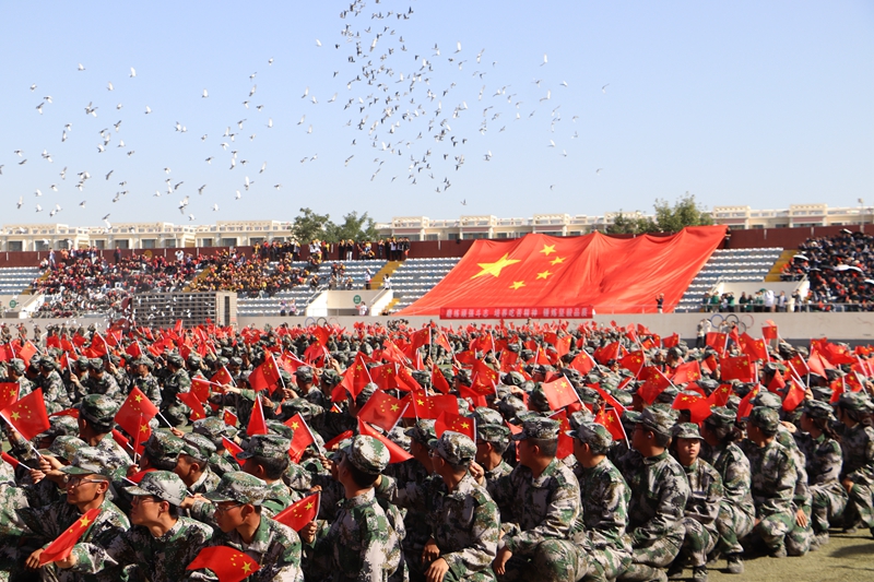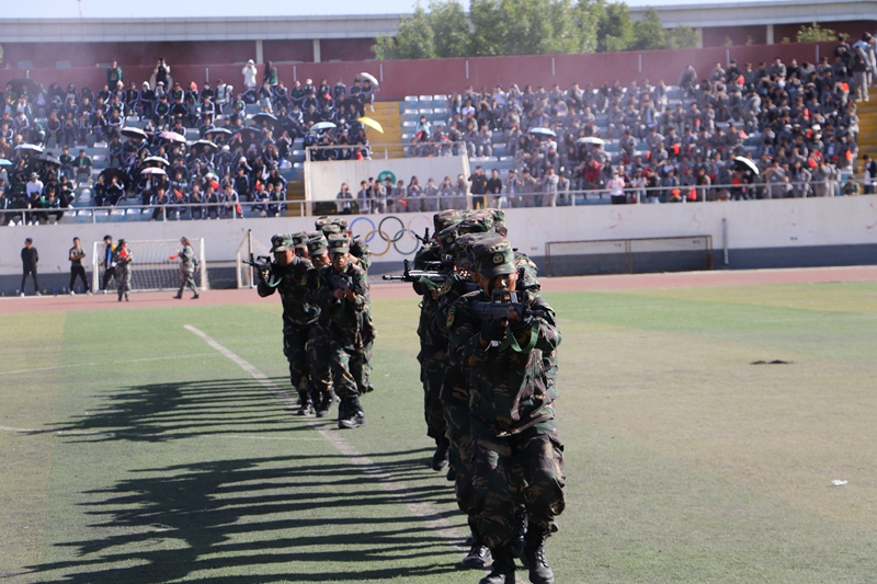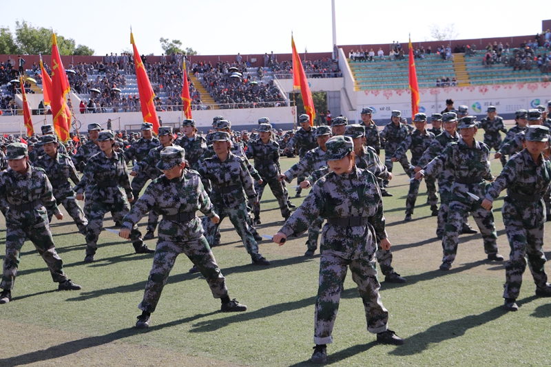 12个军训营代表方阵按照抽签顺序依次展示单个军人队列动作,同学们个个军姿挺拔、精神饱满,充分展示了意气风发、昂扬向上的精神风貌,诠释了扎根大漠,荫泽苍生的胡杨精神。会操结束后,匕首操、擒敌拳、盾棍术及国防教育学院学员代表进行班(排)技战术展示,逐一上场亮相,同学们眼神坚定,防守攻击,一招一式,尽显干练风范,刺、闪、挥、劈、挡,招招凌厉;拳打、脚踢、摔打,出拳有力而坚定,踢腿快速而凌厉,生动诠释着踔厉奋发的昂扬姿态。会操结束后,千人团体操表演将现场气氛推向高潮。