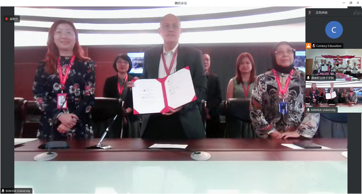 2023年9月20日,学校与马来西亚玛莎大学举行线上合作办学签约仪式。学校党委书记、校长易志军,党委委员、副校长王立智和国际交流处、医学院、教育与艺术学院负责人以及玛莎大学委托代表马来西亚世纪教育有限公司执行董事郭红女士一同出席酒泉线下会场。
