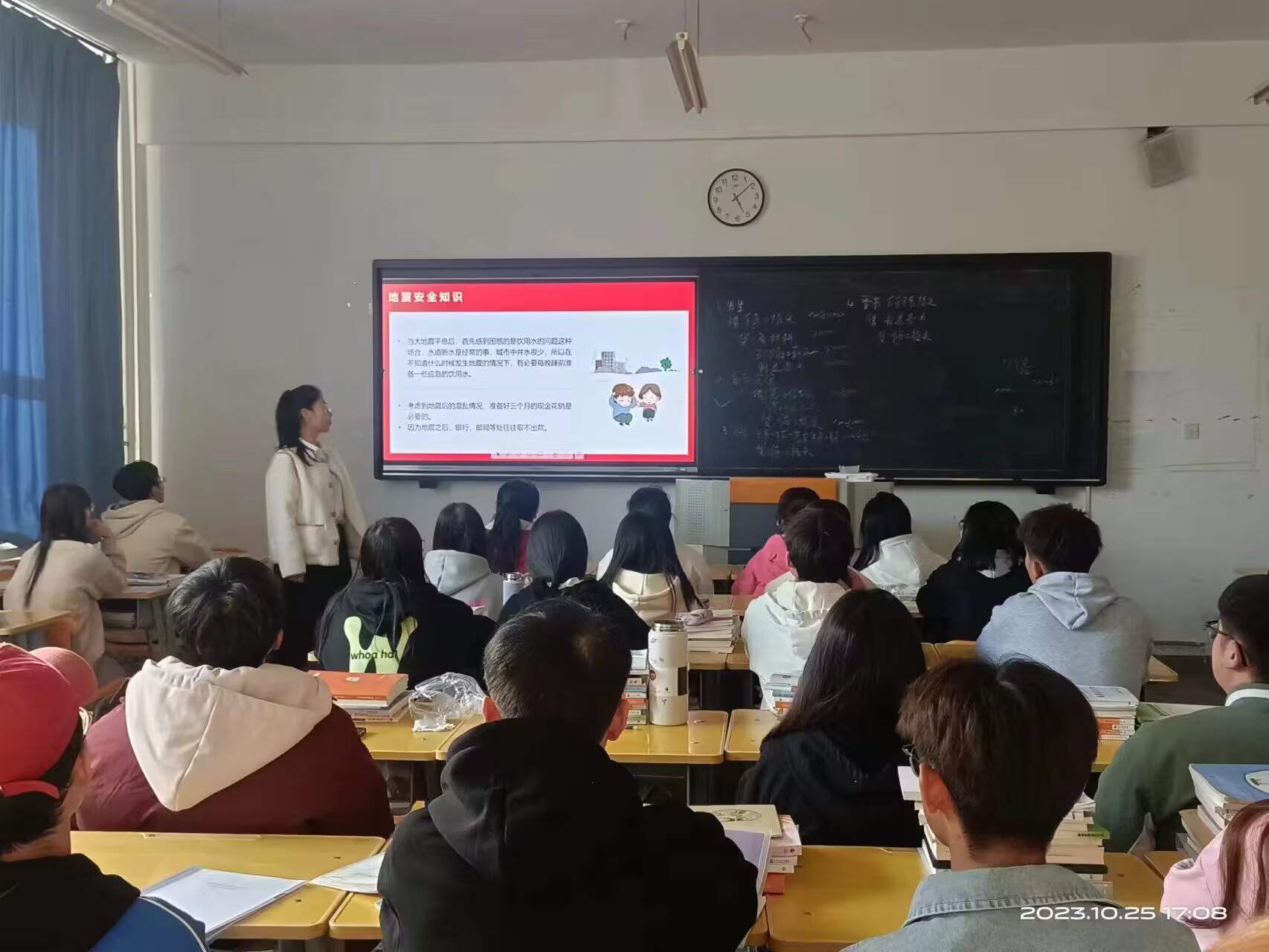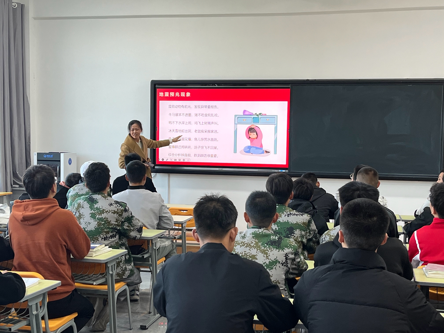 活动开始前,老师结合《地震应急疏散演练须知》、防震减灾,科普先行课件对全体学生开展避震防灾自救培训,17:30,随着警报声的响起,正在各教学楼宇、实验实训室、图书馆、宿舍、体育场内学生在老师的组织下,迅速在安全位置进行躲避防护,,待“险情”暂时平稳,师生有序撤离集结到校内安全地带,各学院迅速组织班主任清点人数,模拟受伤人员进行紧急救护,全校师生做到了全程确保安全无意外。