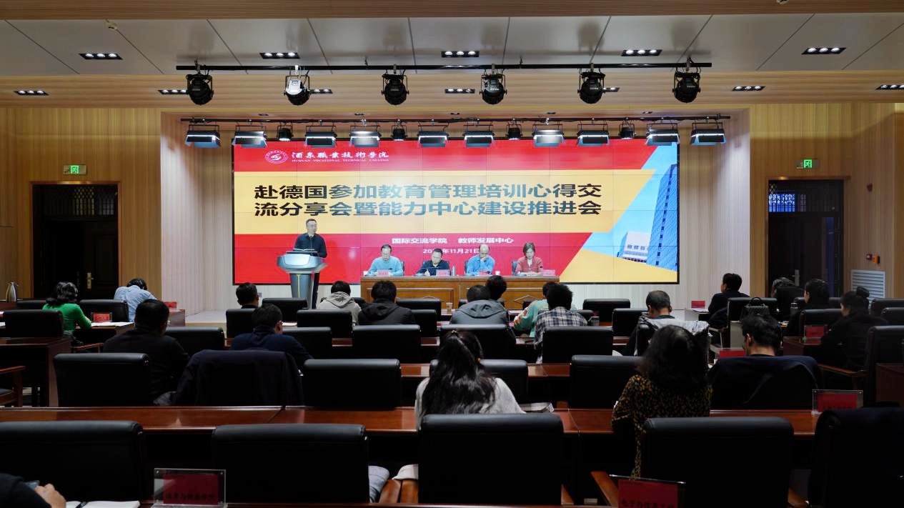要闻快递 > 正文11月21日下午,国际交流学院和教师发展中心携手举办“赴德国参加教育管理培训心得交流分享会暨能力中心建设推进会”。会议由国际交流学院陈瑞副院长主持,学校党委委员、副校长王立智,新能源、护理、学前教育、汽修能力中心建设团队全体成员,教务处、教师发展中心主要负责人,各二级学院分管教学副院长、教研室主任及卫校、工贸中专教研室主任出席了会议。会议还同时进行了网络在线直播。