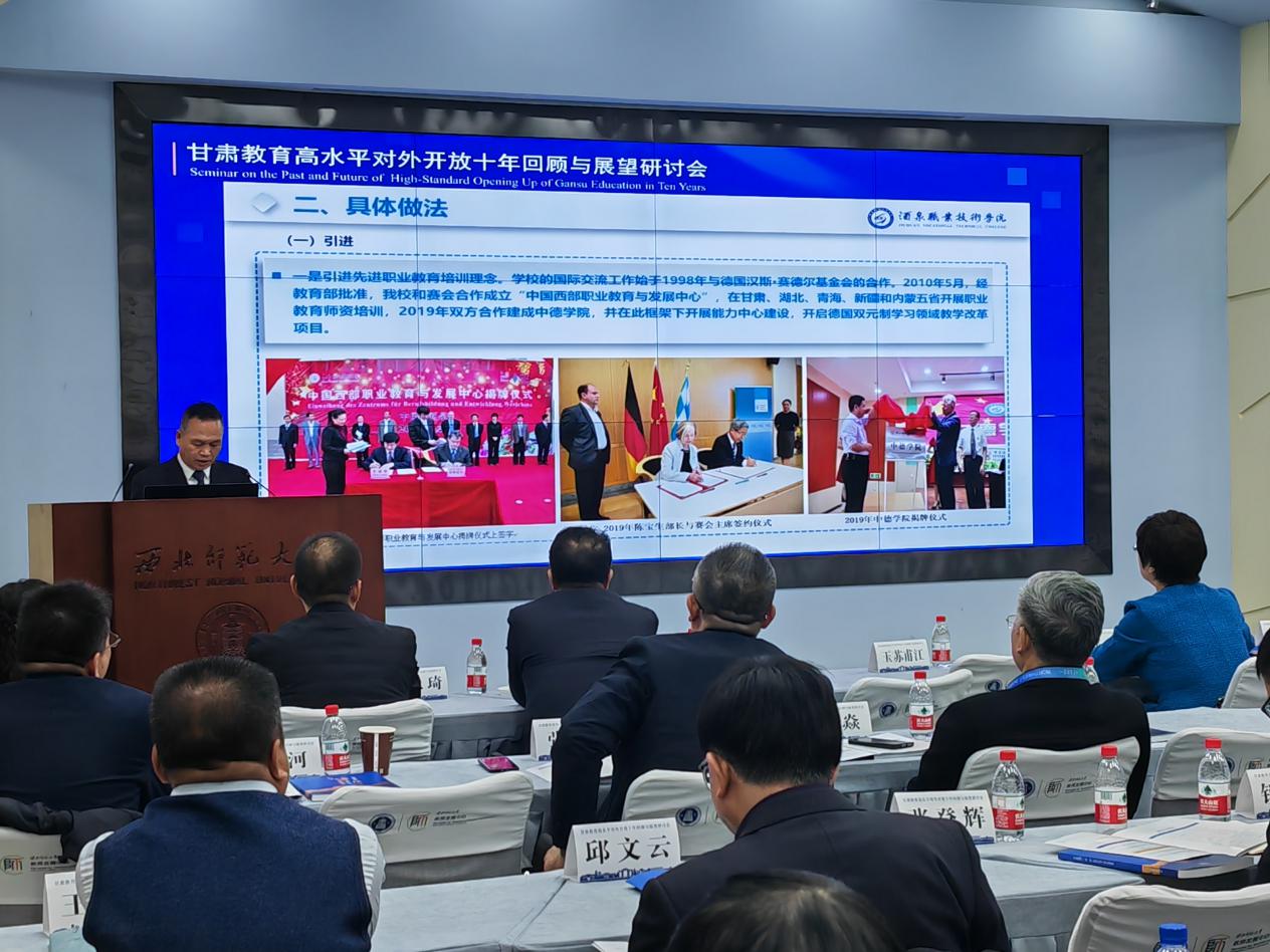 12月11日,省教育厅召开“2023年亚欧国际教师教育论坛暨甘肃教育高水平对外开放十年回顾与展望研讨会”,王立智副校长代表酒泉职业技术学院参加会议并在“甘肃教育高水平对外开放十年回顾与展望研讨会”分论坛发表了题为《引进 融生 输出——酒泉职业技术学院创新高职教育国际化模式探索》的交流发言,全面总结了我校多年来国际交流工作的成就与经验,与其他高校一起探讨推进职业教育高水平对外开放的方法路径,为更好服务新发展格局凝聚共识,贡献智慧和力量。(信息员:国际交流学院 陈瑞)