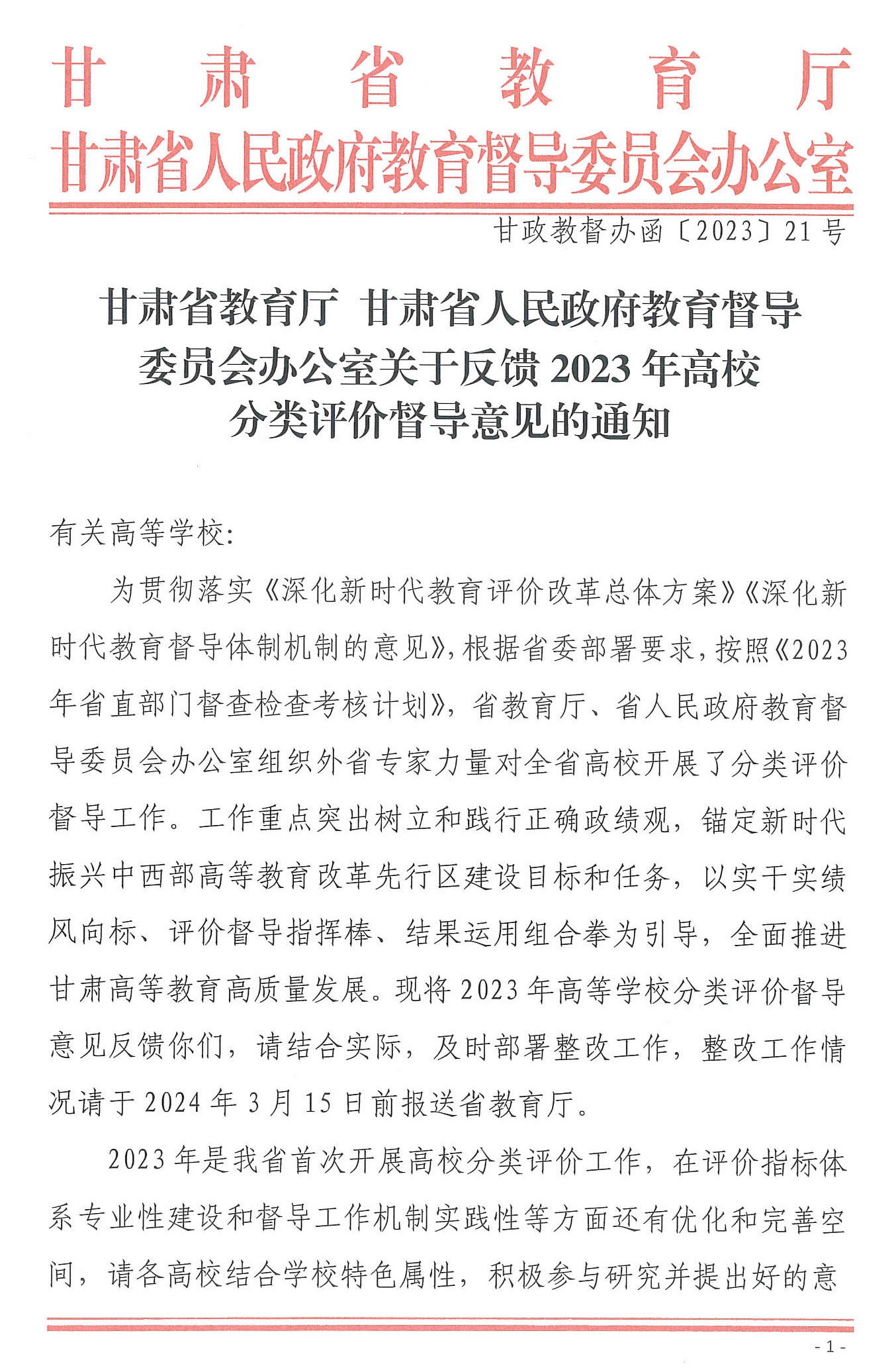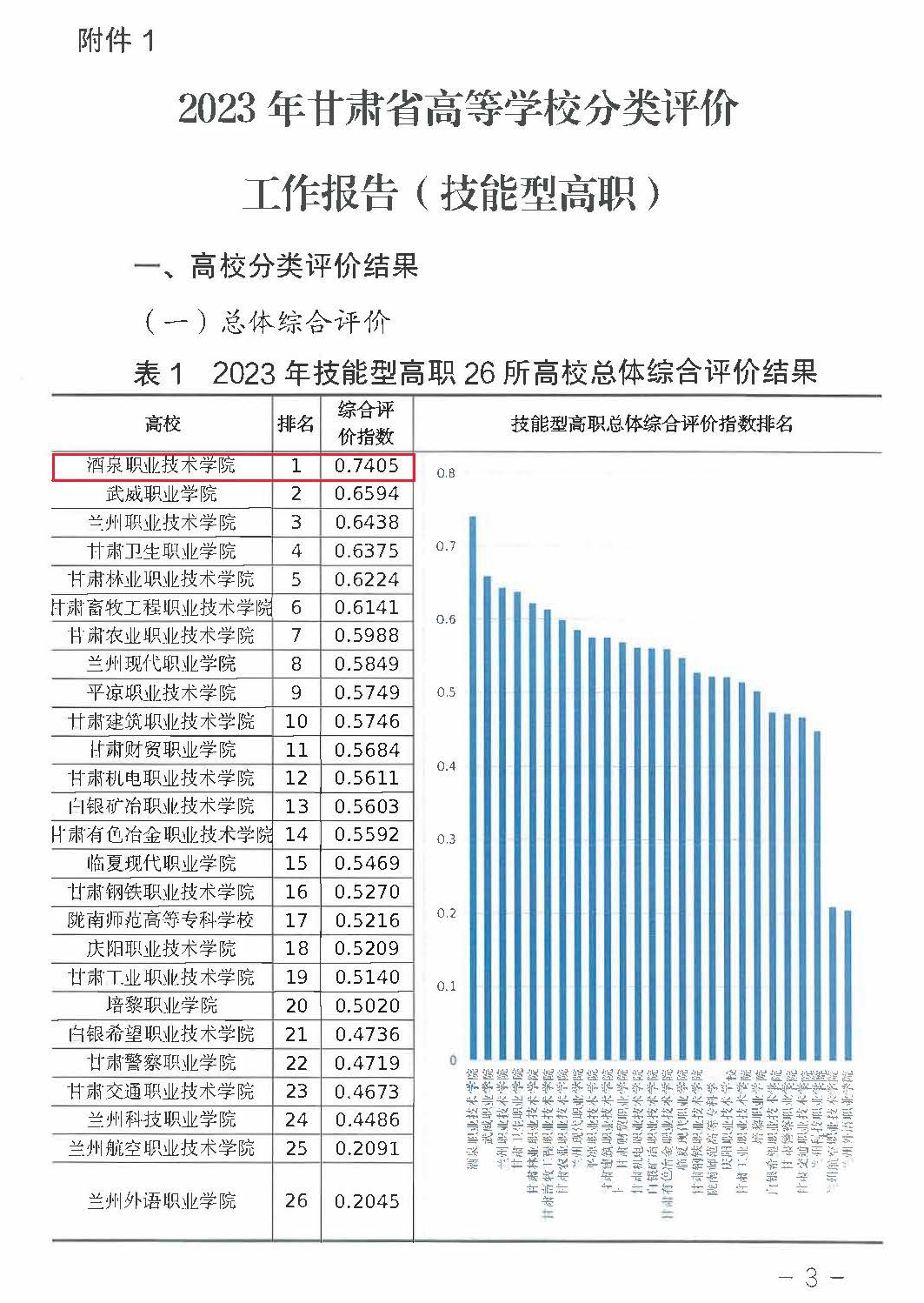 近日,甘肃省教育厅、甘肃省人民政府教育督导委员会办公室公布2023年高校分类评价结果。我校在2023年技能型高职26所高校总体综合评价结果排名第一。