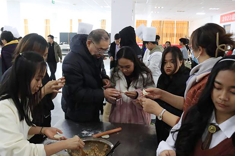 旅游与烹饪学院领导、老师和部分中国学生为留学生准备了基本食材、讲解了中国饮食文化。之后,结对子老师为相应留学生示范包饺子的技巧和手法,手把手现场教学。留学生全程沉浸式体验中国传统美食饺子的制作过程,深入了解中国的饮食文化,感悟中华优秀传统文化的魅力。现场笑声连连,精彩不断。(信息员:国际交流学院 高玉婕)