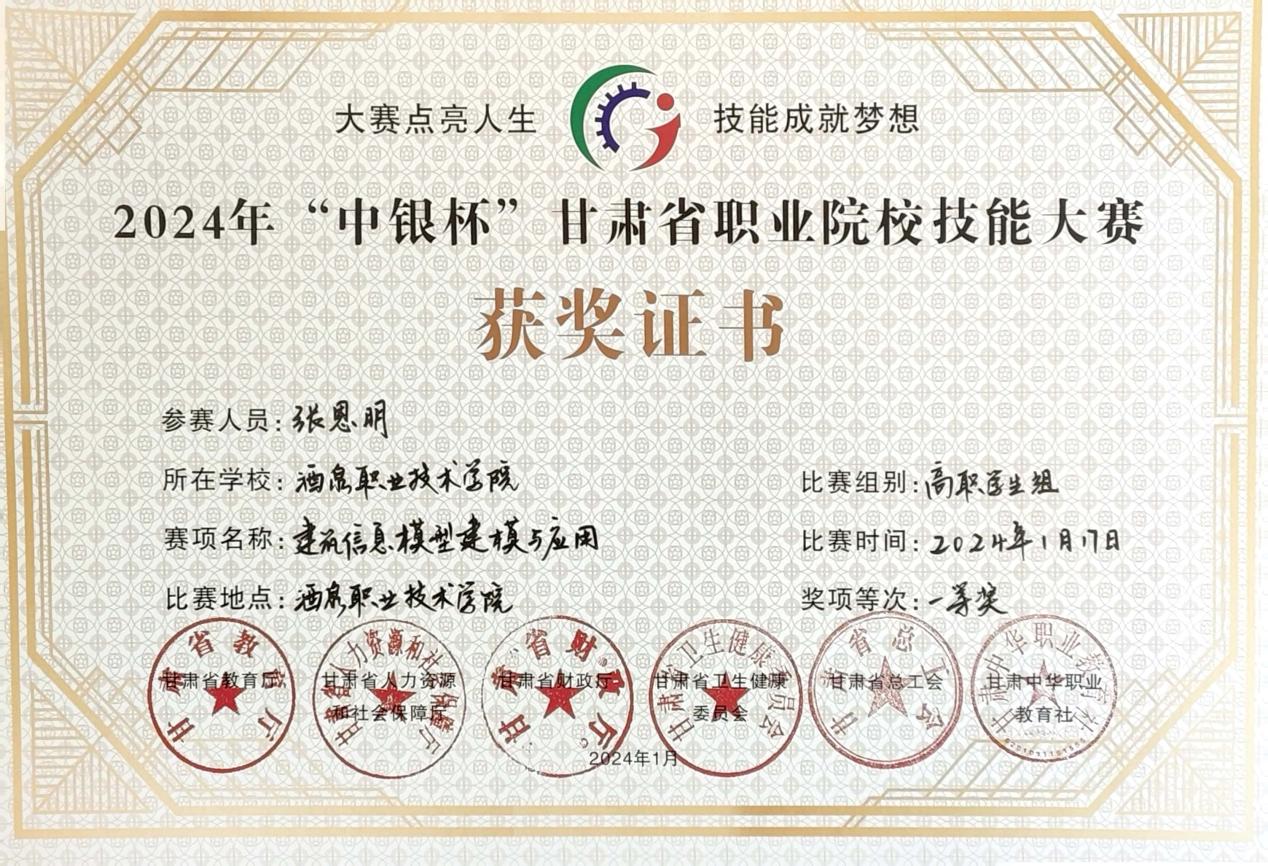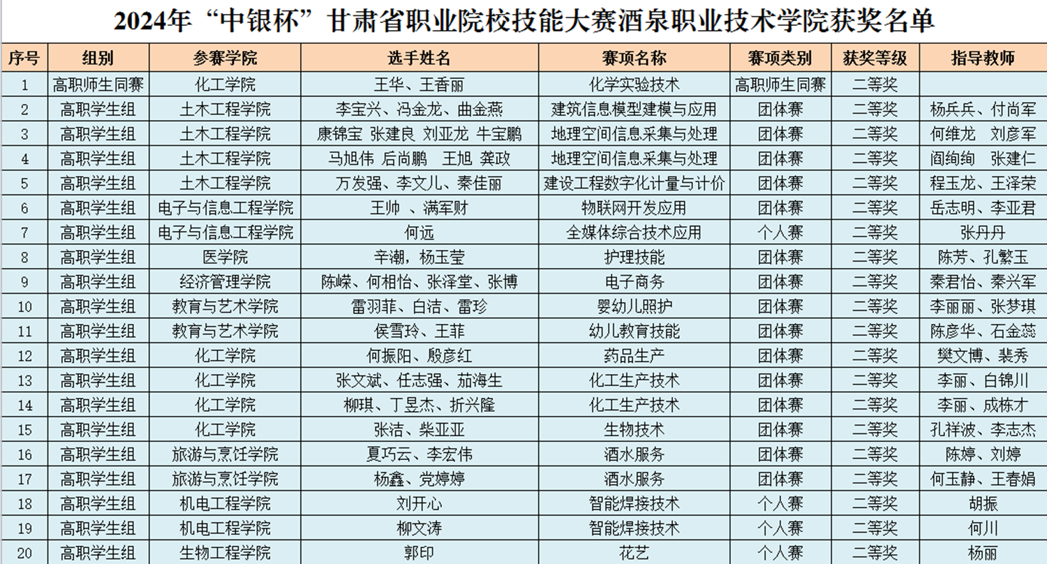 要闻快递 > 正文2024年“中银杯”甘肃省职业院校技能大赛于1月20日圆满落幕。本届大赛共有全省29所高职院校、1所技师学院、119所中等职业学校、23所技工学校的7992名学生、1334名教师,在全省24个赛点17个大类165个赛项中进行技能比拼。我校共派出199名学生、32名教师参加51个赛项的比赛,经过紧张激烈的角逐,共获得一等奖13项,二等奖20项,三等奖32项的优异成绩。其中化工生产技术、生物技术、智能焊接技术、酒水服务、研学旅行、水利工程BIM建模与应用、市政管线(道)数字化施工、地理空间采集与处理、建筑信息模型建模于应用与新型电力系统技术与应用等10个赛项拟获得2024年全国职业院校技能大赛的参赛资格。