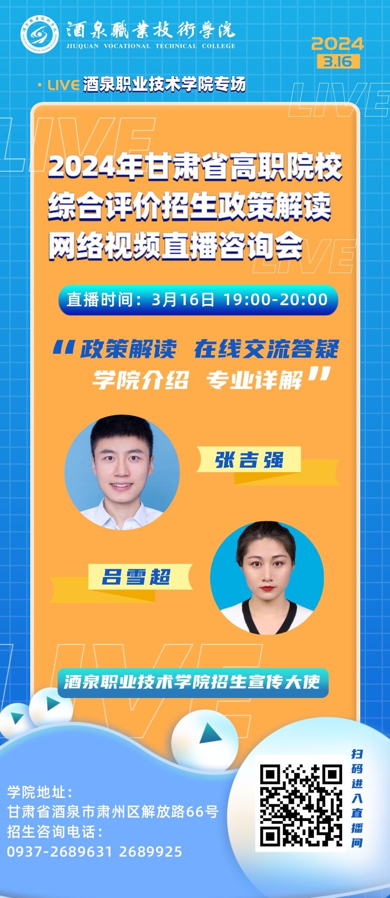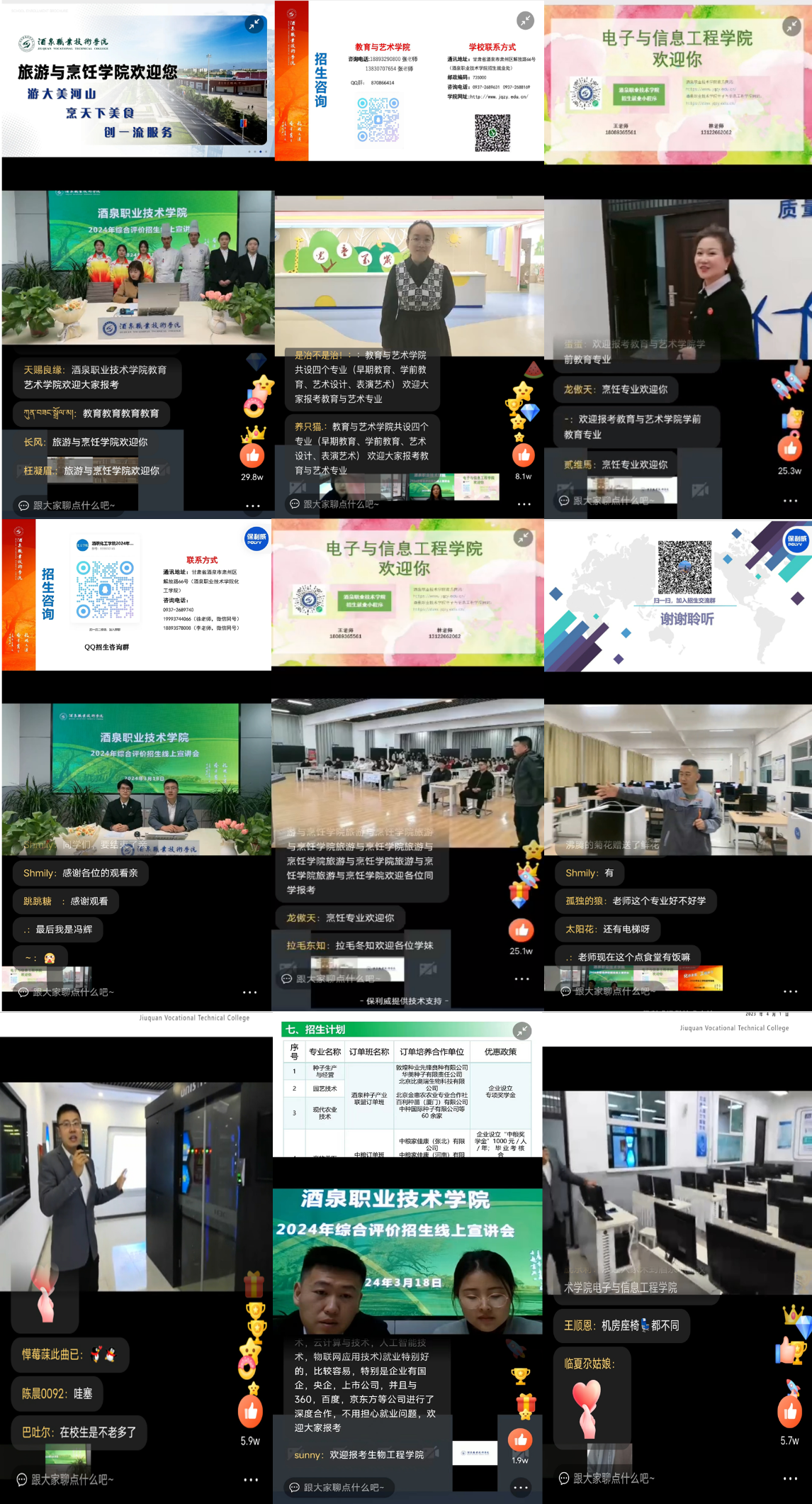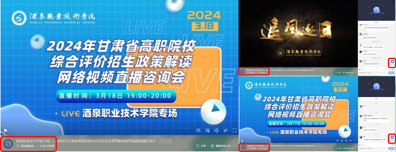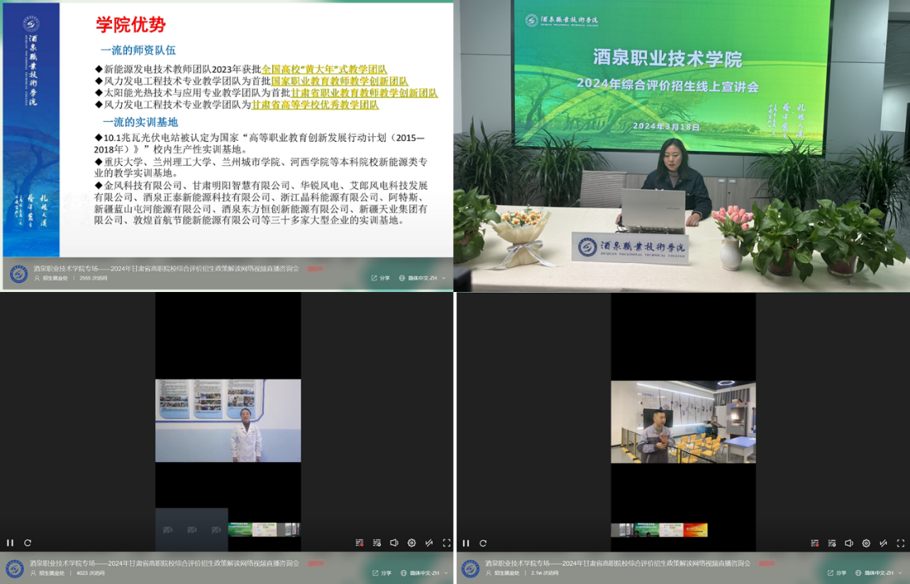 在直播中,张吉强、吕雪超两位老师详细介绍了酒泉的地域经济、学校的招生考试政策、办学实力、专业特色、师资队伍、就业优势、校园文化、学习环境等学校特色和成就。电子与信息工程学院副院长王迎春通过直播镜头展示了学校的学生公寓、食堂以及部分功能教室,让考生和家长更详细的了解学校的办学硬件优势和实力。