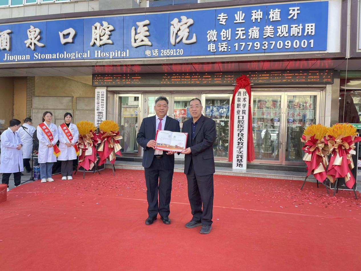 酒泉职业技术学院党委副书记许军代表学校与酒泉口腔医院院长孙吉峰共同为教学实践基地揭牌,并向孙吉峰院长颁发聘书。