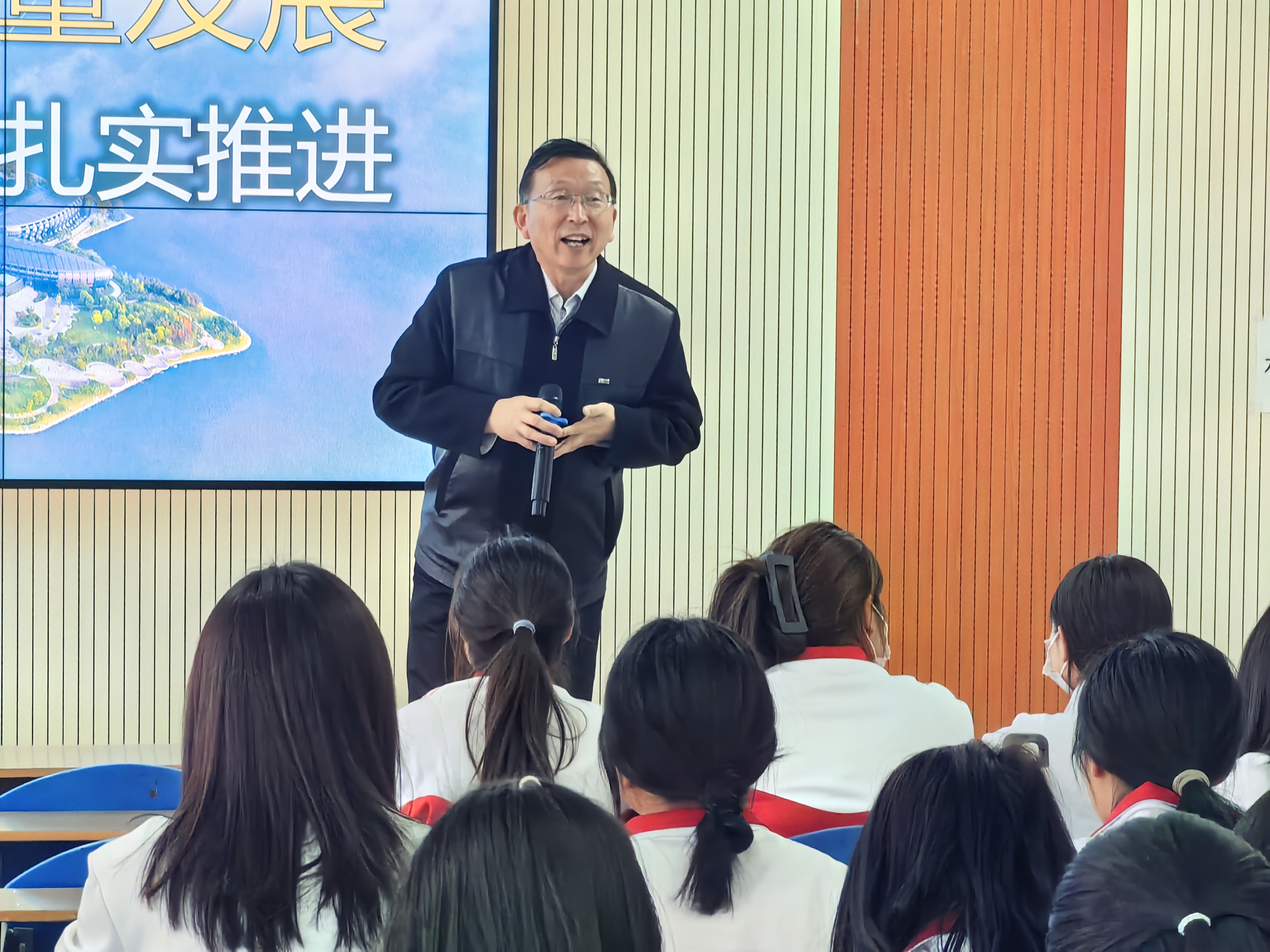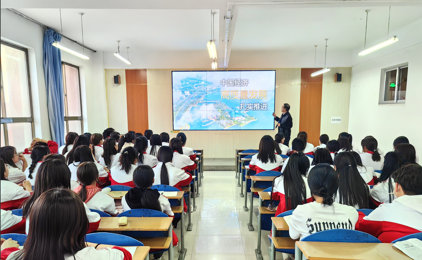 易书记以“东方甄选甘肃行动”“天水麻辣烫”等同学们耳熟能详的案例为切入点,从“坚持稳中求进,实现更有分量的发展”“推动转型升级,实现更有质量的发展”“增进民生福祉,实现更有温度的发展”“提升开放水平,实现更有活力的发展”四个方面讲授我国经济回升向好的发展态势。围绕当前国内外热点问题从“短期看,面临外部压力和内部困难”“长远看,中国经济有信心、有底气”两个方面讲授我国经济发展面临的复杂环境和具有的坚实底气。结合影视资料从“以科技创新引领现代化产业体系建设”“着力扩大国内需求”“深化重点领域改革”“坚持不懈抓好‘三农’工作”“切实保障和改善民生”五个方面讲授我国经济高质量发展的重要举措。易书记教育引导学生要充分认识中国经济大盘坚实有力,中国经济高质量发展成色十足,经济回升向好、长期向好的基本趋势,辩证看待我国经济面临的风险挑战,充分认识到我们具备的优势条件,切实提高自身本领,增强社会责任感和使命感,在经济社会高质量发展中贡献青春力量。