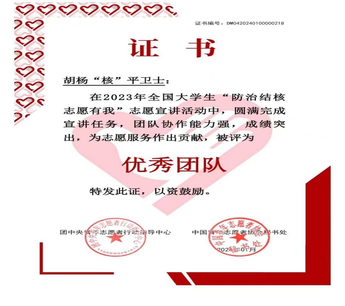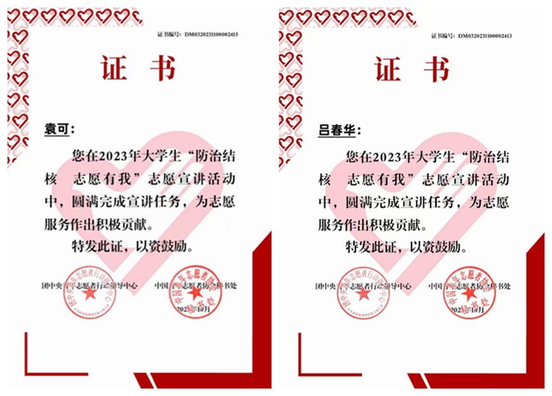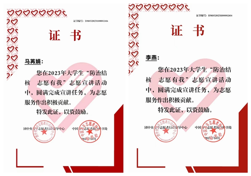 2023年5月,国家疾病预防控制局传染病防控司、团中央青年志愿者行动指导中心联合发布了《关于遴选2023年全国大学生“防治结核 志愿有我”志愿宣讲团的公告》,从全国780所高校的1797支团队中遴选出1000支大学生志愿服务团队开展志愿宣讲活动,并于2024年评选出100支优秀宣讲团队。酒泉职业技术学院胡杨“核”平卫士志愿服务队成功入选,获评为“优秀团队”,这一荣誉不仅是对团队成员辛勤工作的认可,也是对学校教育成果的肯定。
